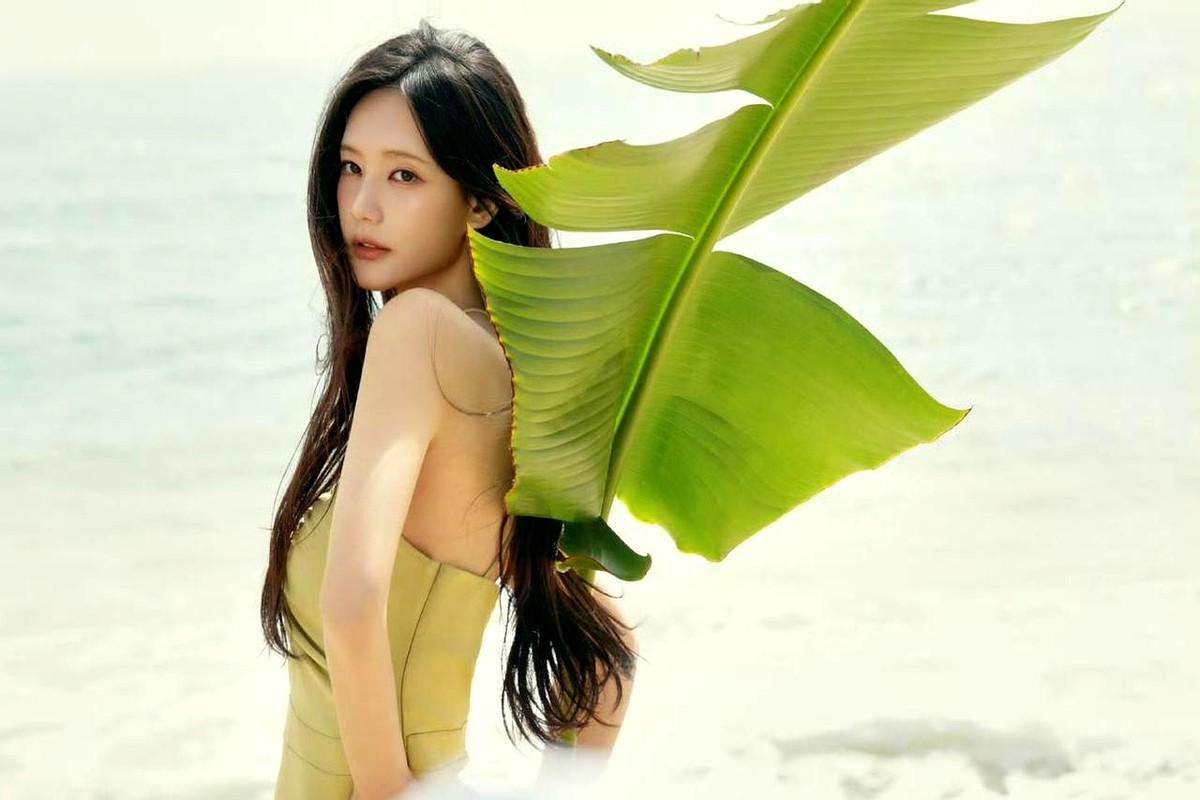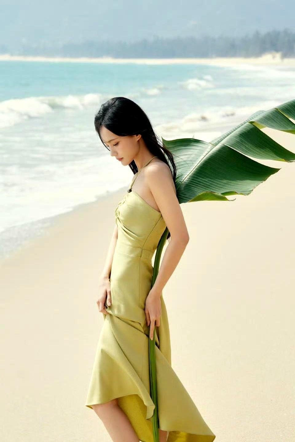 照片里,她要么靠着枯木,要么拿着巨大的芭蕉叶,光影打在身上特别有感觉。奶油色的裙子,配上蓝天碧海,每一帧都像是电影画面,治愈感满满。