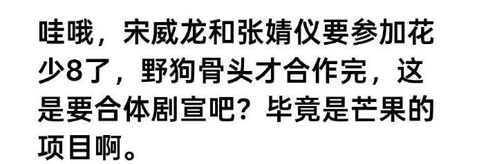 宋威龙、张婧仪要合作花少8了,刚好野狗骨头也在那个时排播,期待吗?