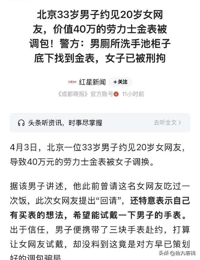 “一个贪财、一个好色。”北京,一个33岁的男子,经不住网上一个女子的引导,急着线下见面。男子摆阔带着40万元的大劳,女子瞬间就两眼冒光。吃完饭女子提出回请,主动给了男子价值1000元的礼物,之后提出想要看看男子的大劳,没想到,趁男子不注意,女子拿出网购300元的赝品,给男子来了个“狸猫换太子”,事后男子才发现被掉包,赶紧报了警。