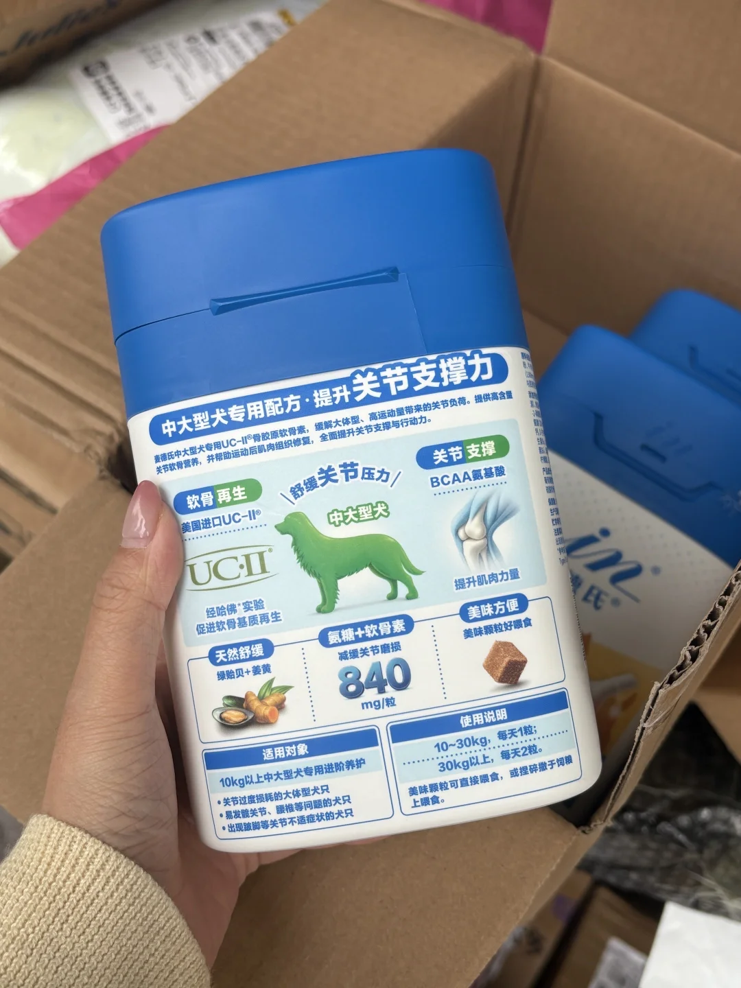 对我们大狗来说,养护版的含量太低了,医护版的又加了msm,不是含量不够就是有伤肝风险,搞得我每次都要给他吃一阵停一阵......真的很麻烦。但是!这款真的完全戳中我!它不仅给中大型犬专门做了高含量,还针对大型犬的关节压力,特别添加了UC-II®+BCAA+维B,专门来提升关节支撑力!