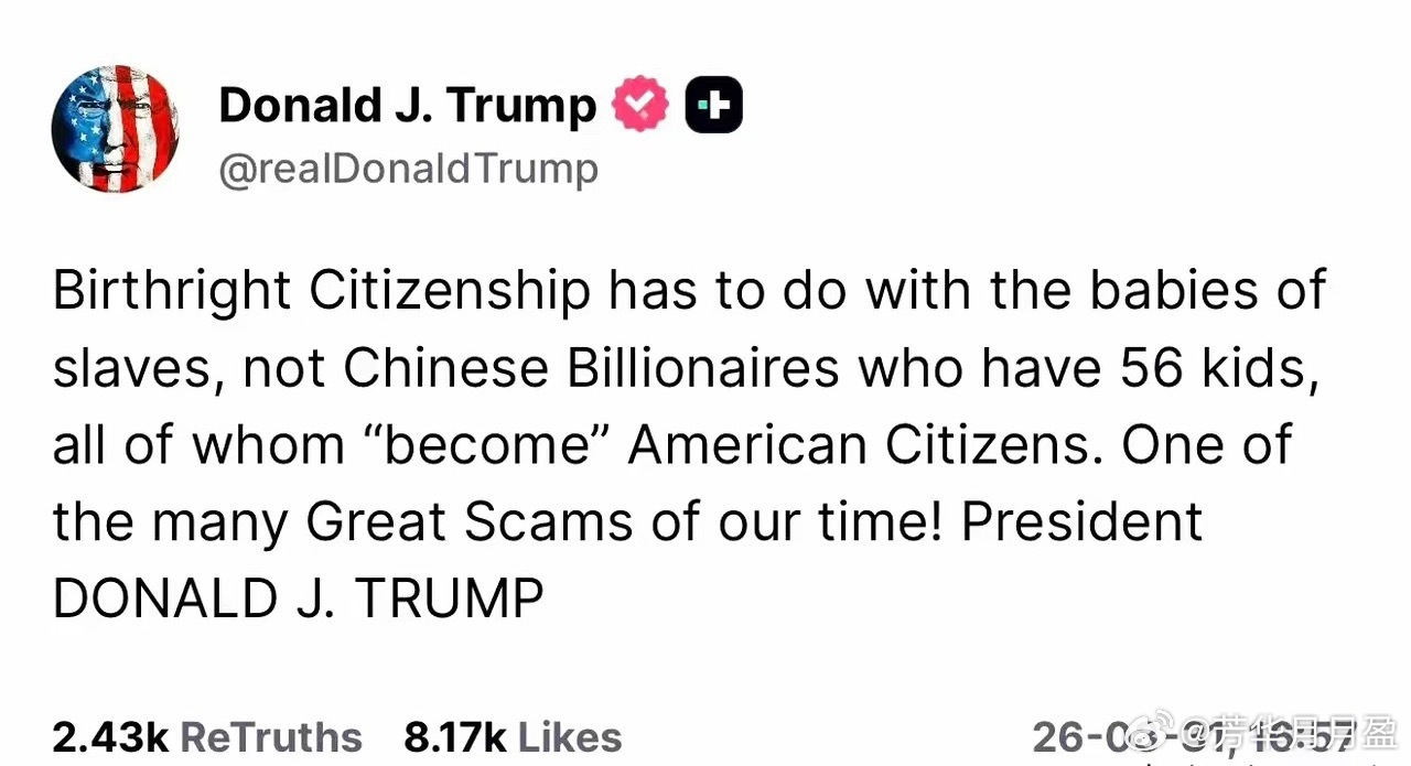川普说有中国人在美国生了56个孩子,这些孩子都拥有美国国籍,他对此感到痛心,准备