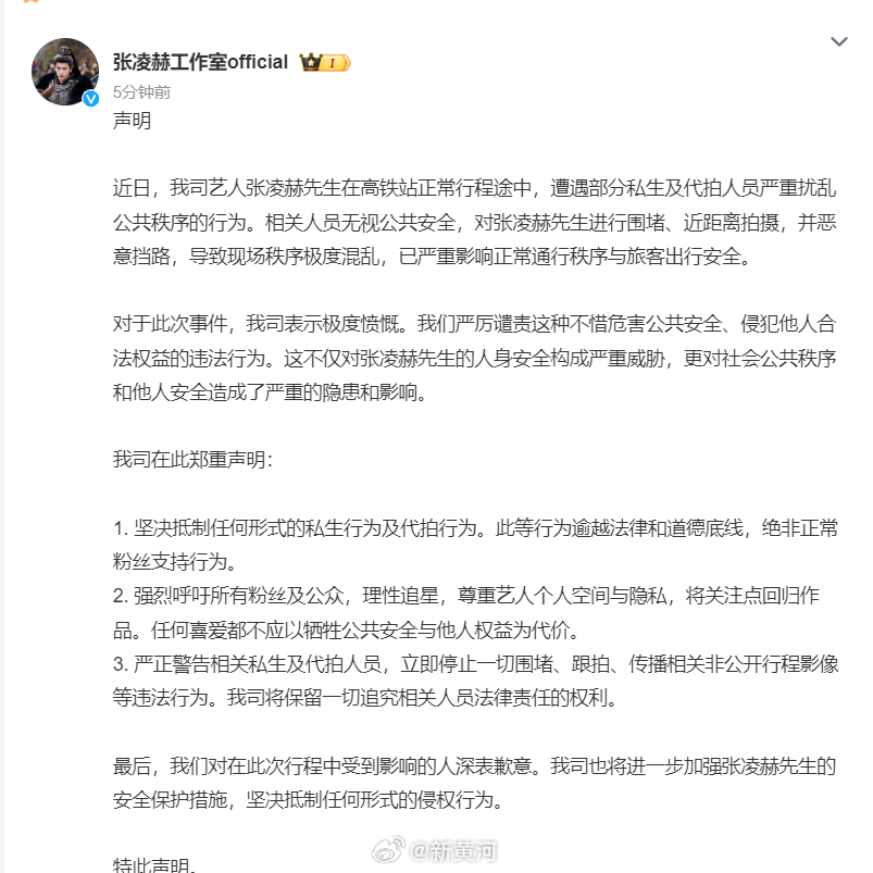 【#张凌赫方发文抵制代拍#】#工作室回应张凌赫高铁站遭围堵# 5日, 发文抵制代拍:近日,我司艺人张凌赫先生在高铁站正常行程途中,遭遇部分私生及代拍人员严重扰乱公共秩序的行为。相关人员无视公共安全,对张凌赫先生进行围堵、近距离拍摄,并恶意挡路,导致现场秩序极度混乱,已严重影响正常通行秩序与旅客出行安全。