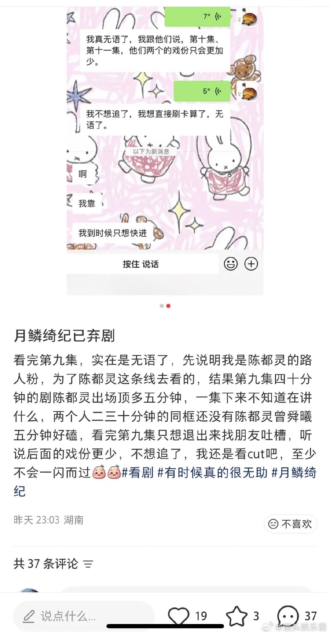 网友说因为陈都灵、曾舜晞《月鳞绮纪》戏份太少,要弃剧了