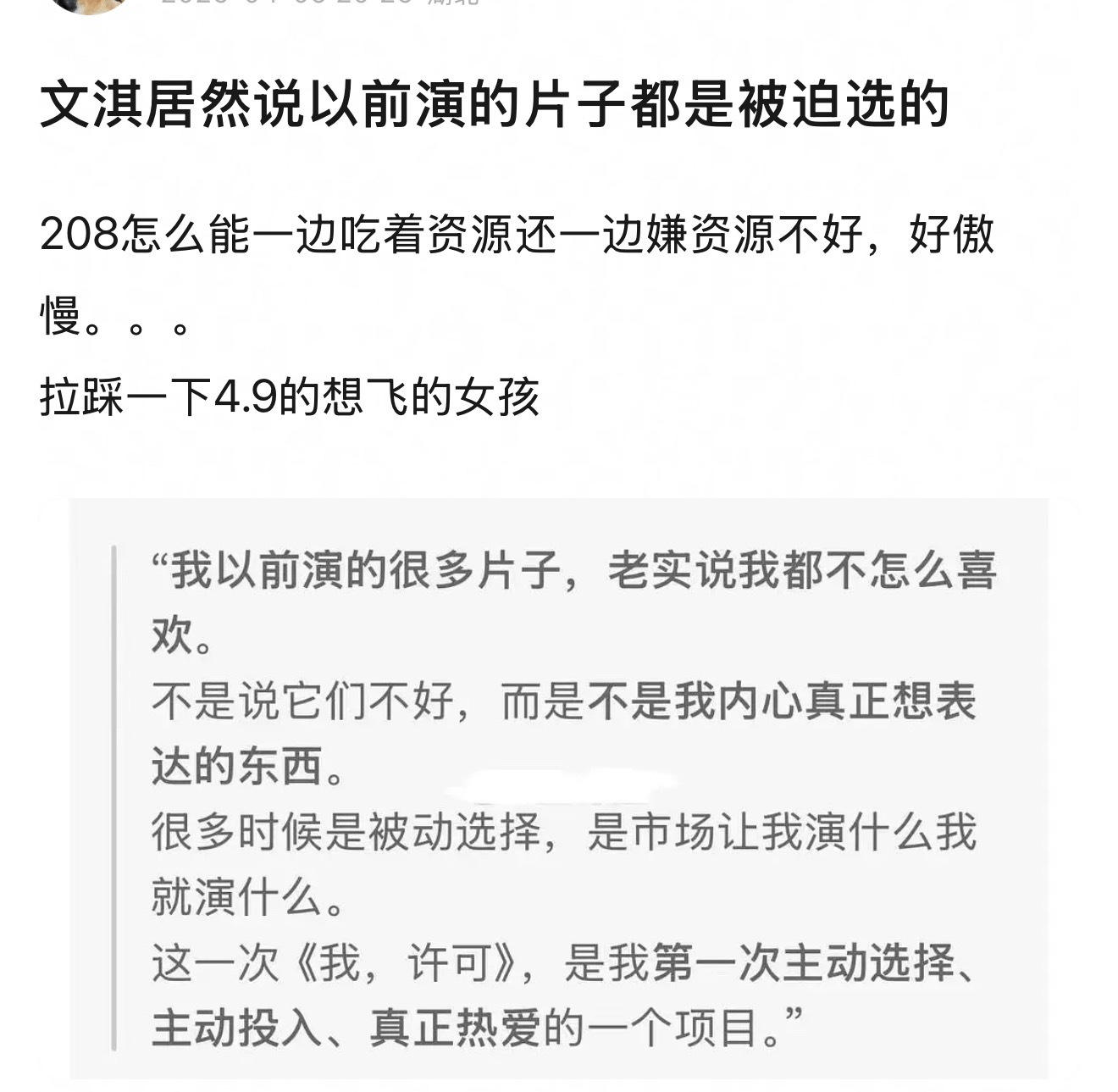文淇居然说以前演的片子都是被迫选的,血 观 音给她赋了多少魅还不满意,她这样真的不会得罪以前的合作方吗?