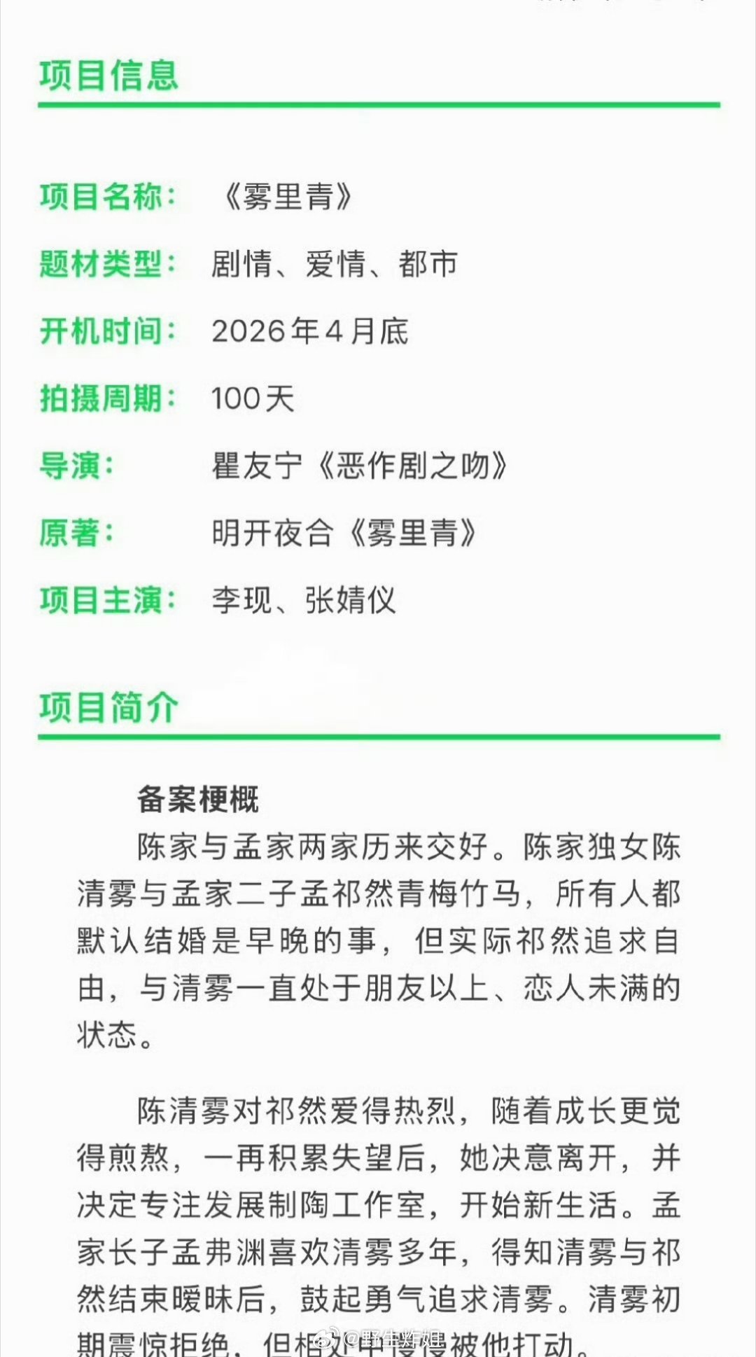 李现和张婧仪主演的《雾里青》将会在四月二十九号正式在广州开机,这两位的初次合作,
