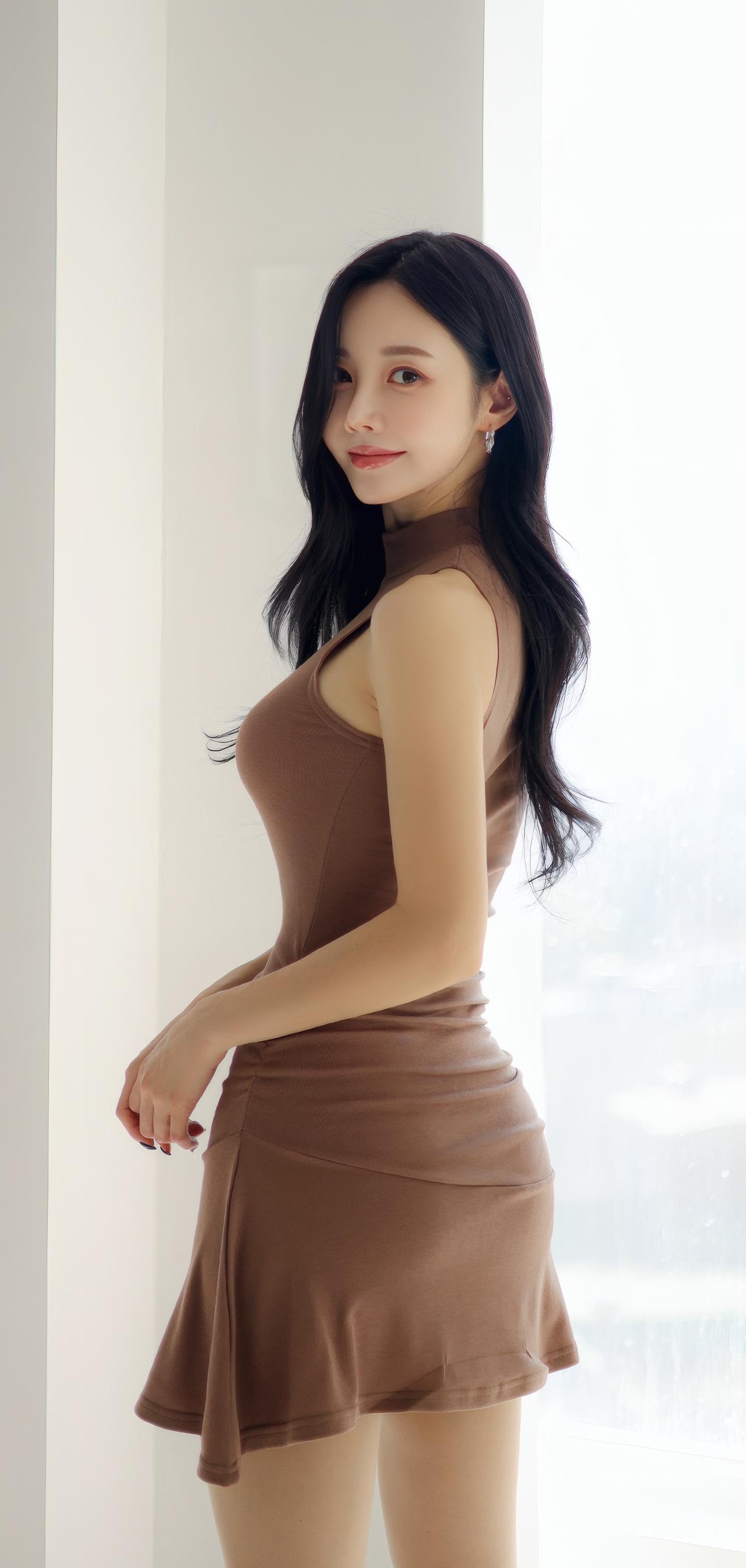优雅棕色连衣裙,搭配白色高跟靴,尽显时尚与气质。