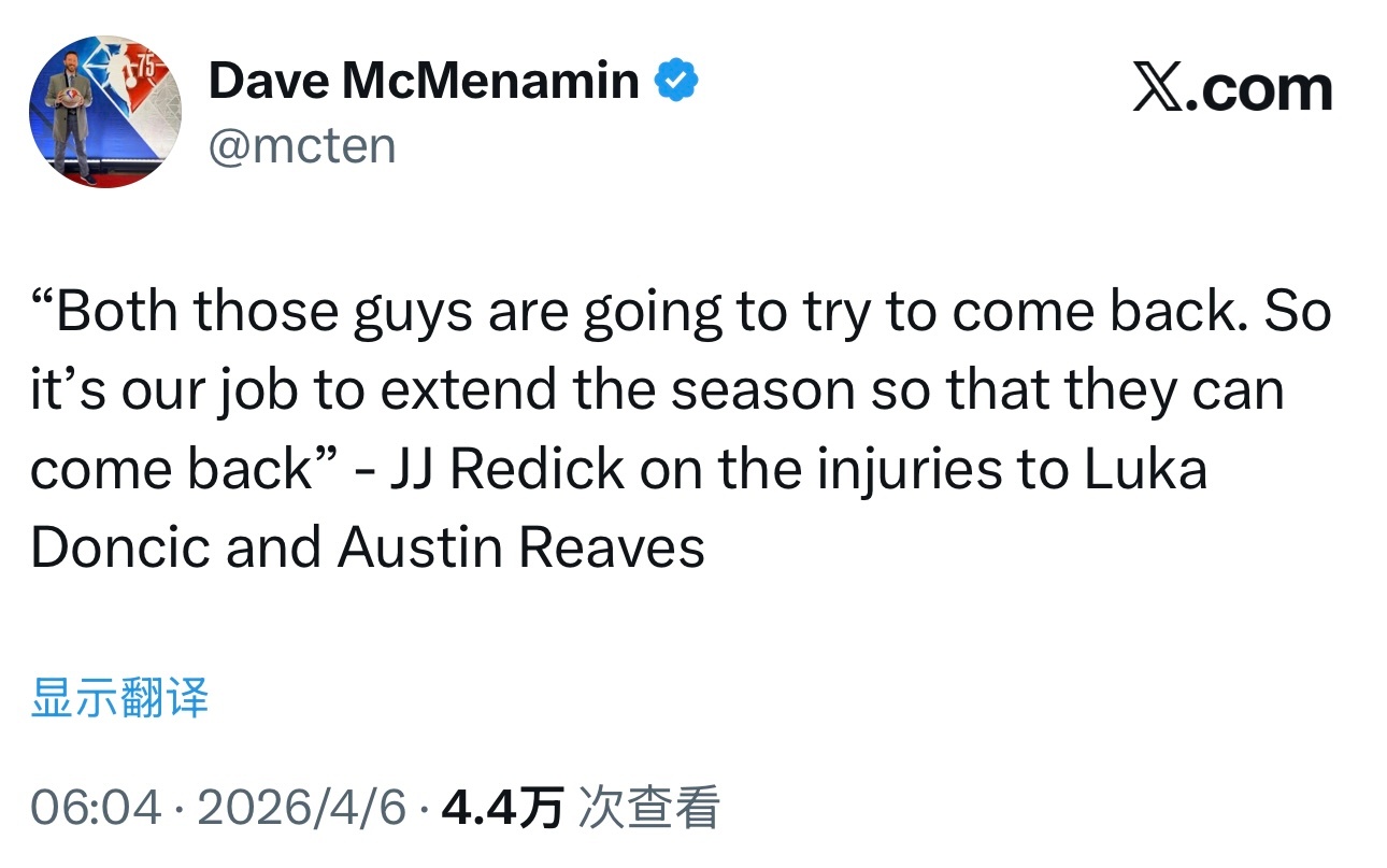 雷迪克谈东契奇与里夫斯的缺阵:“这两位球员都将努力回归赛场,我们的职责是延续这个