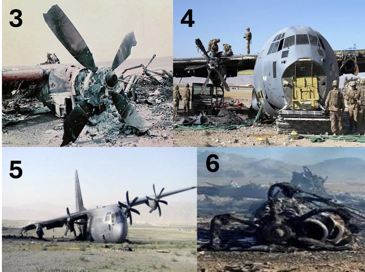 第三点:钢/铝桨叶会断裂。MC-130J R391 桨叶会破碎并可能熔化。我们从损毁飞机上看到的图片(图 6)显示了 6 个桨叶。因此,这些是 MC-130J 的 Dowty 桨叶(它们会熔化)。正如您在图 4 和图 5 中看到的,当桨叶没有熔化而是断裂时,它们会撕裂并断裂。它们不会弯曲。从C-130H型钢/铝螺旋桨的叶片可以看出,它们会断裂、折断或弯曲,但不会破碎或熔化。