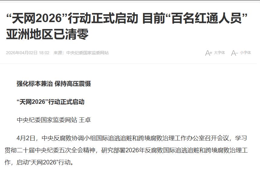 4月2号当天,中央反腐败协调小组国际追逃追赃和跨境腐败治理工作办公室就召开了专门会议,正式启动“天网2026”行动,而且当天就有了重大突破,这就是对境外贪官最直接的震慑。
