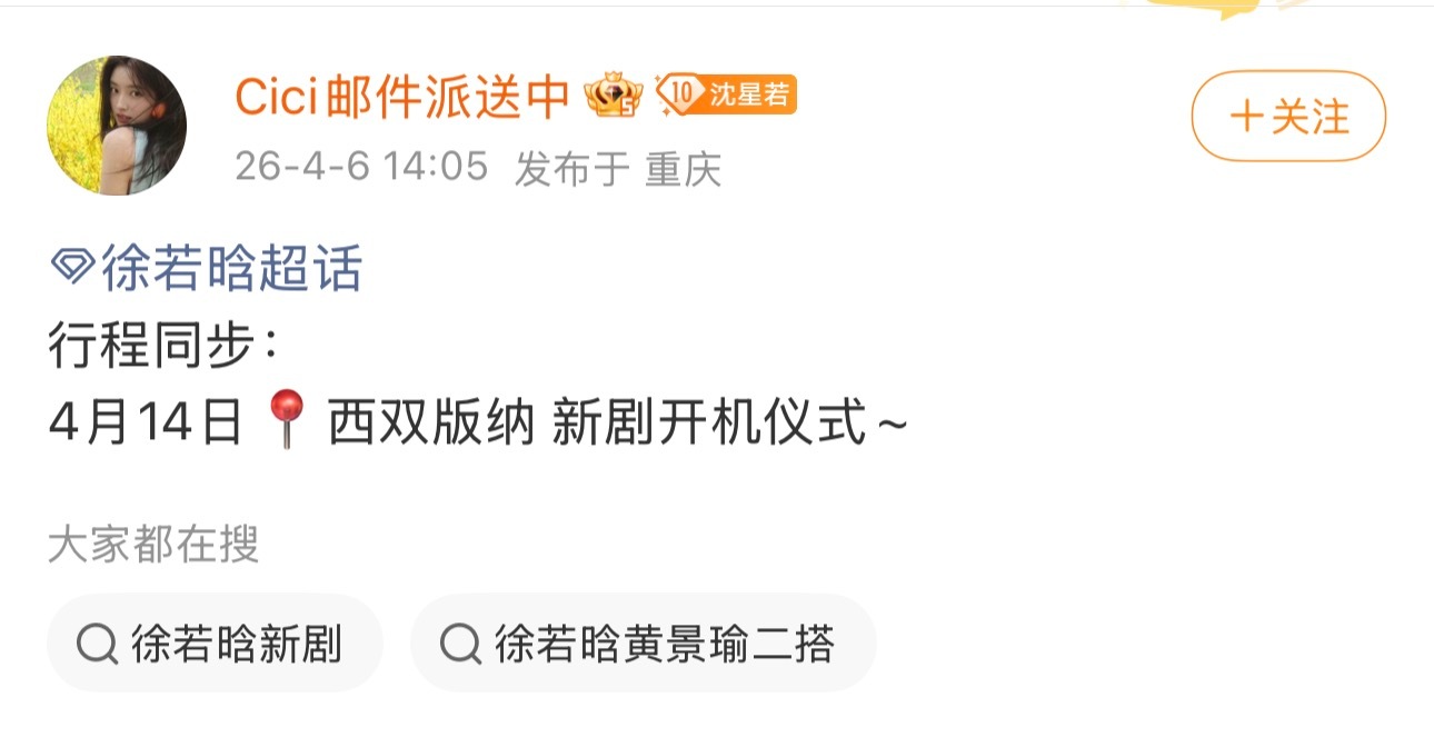 明川有知夏 就是黄景瑜徐若晗了4.14开机了