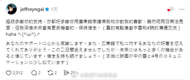 魏浚笙用日文回复女粉丝被赞暖男这位日本女粉丝的真诚长文成功引起魏浚笙本人注意。令人惊喜的是,他并非只是简单点赞或留言,而是特意将回复翻译成日文,贴心确保对方能完全看懂。他先用繁体中文写道:“超级多谢你的支持,亦都好多谢你用广东话表达俾我知你对我的喜欢。”随后再附上日文翻译版本。这一暖心举动随即在网上引发热议,大批网民纷纷留言,大赞他是“世界第一暖男”“红到日本了”。