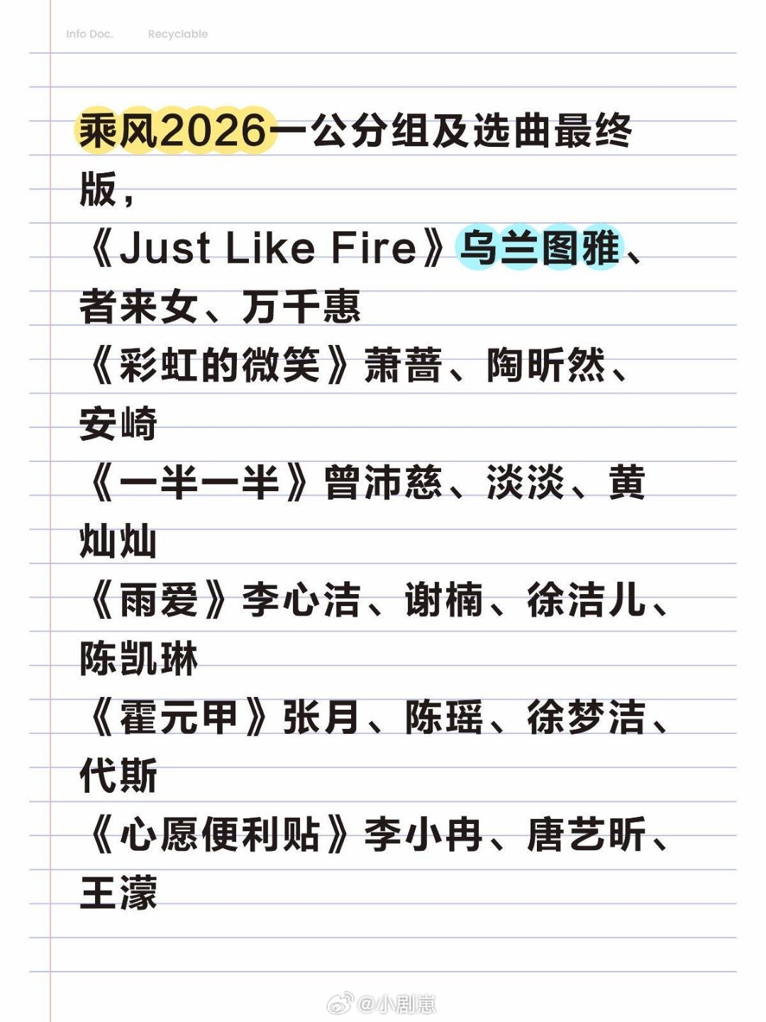 乘风2026一公分组及选曲最终版!《Just Like Fire》乌兰图雅、者来女、万千惠《彩虹的微笑》萧蔷、陶昕然、安崎《一半一半》曾沛慈、淡淡、黄灿灿《雨爱》李心洁、谢楠、徐洁儿、陈凯琳《霍元甲》张月、陈瑶、徐梦洁、代斯《心愿便利贴》李小冉、唐艺昕、王濛《咏春》阚清子、张艺上、温峥嵘《城北的花》叶一茜、范玮琪、侯宇、何宣林《大艺术家》庄法、江语晨、维妮娜《此刻最好的都在身边》孙怡、张慧雯、赵子琪