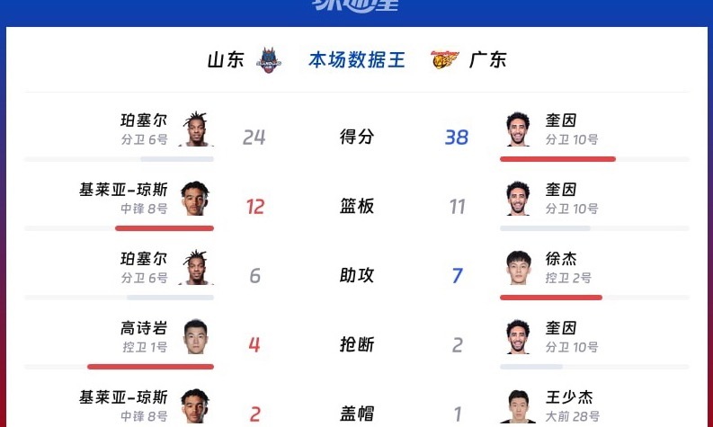 3. 阵容厚度不足:广东萨林杰、萨姆纳双核心伤缺,替补席火力严重不足,全场仅2人得分上双;山东则有5人得分上双,轮换深度碾压对手。