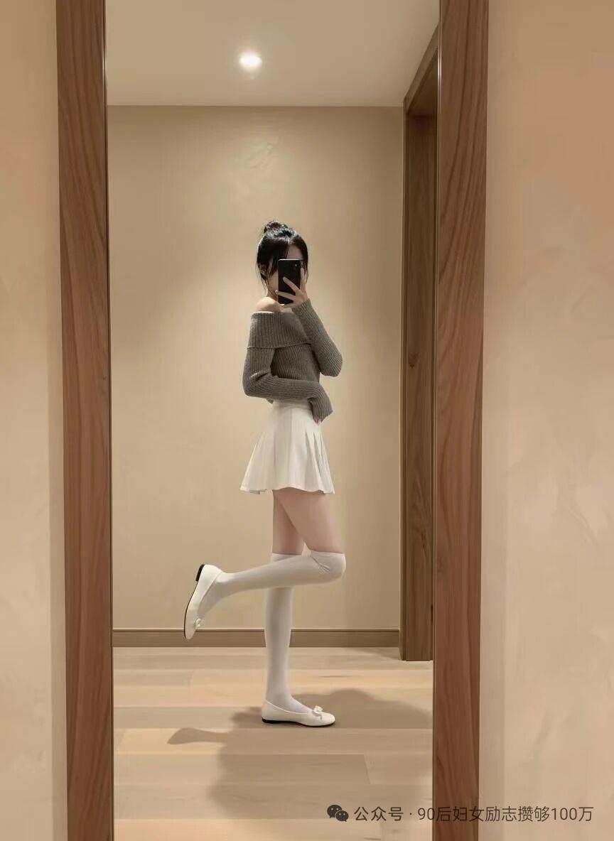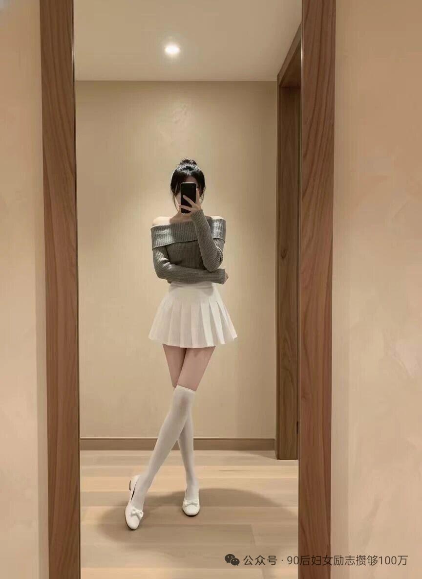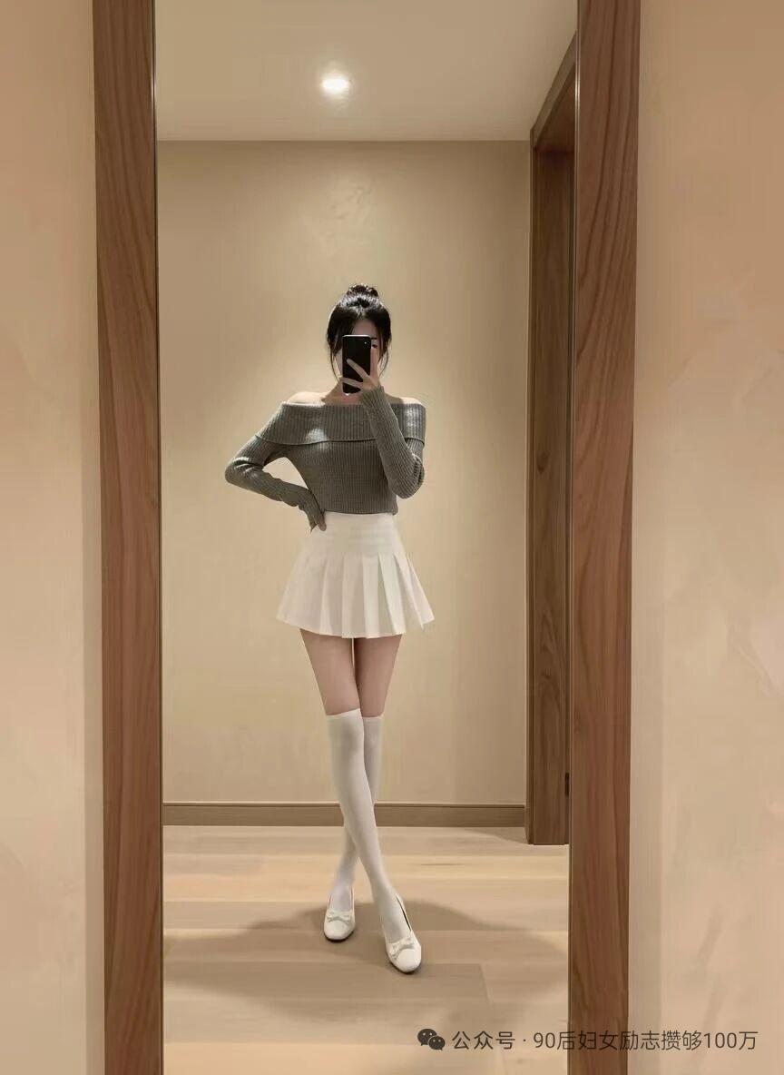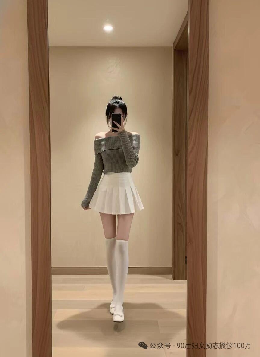 一字肩+百褶裙的甜妹感谁懂啊✨ 灰调针织衫温柔又显气质,露肩设计刚好露出锁骨,氛
