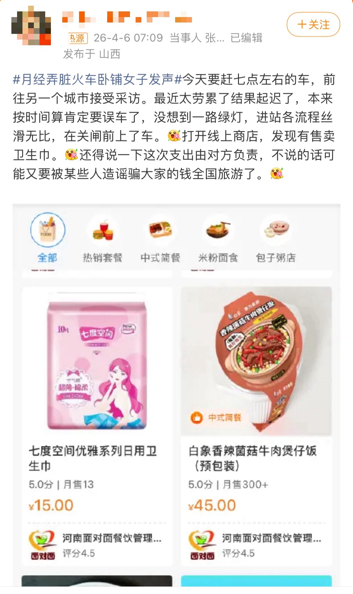 月经弄脏火车卧铺女子发声还真有不少人觉得,卫生巾这东西应该免费的啊