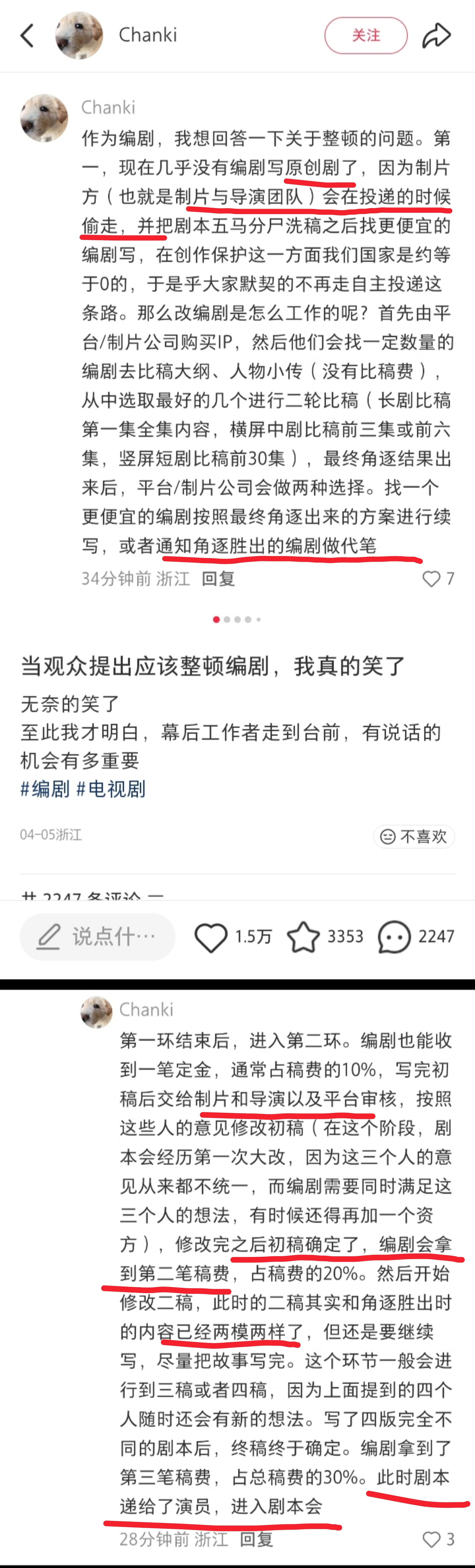 rs那个编剧爆料,说投稿原创剧本会被抄袭。改编的需要按照剧方修改,让出名的编剧署名,有时候只帮忙代笔得不到署名,不是得不到分期的稿费。最后剧本按所有人的要求改完后。小编剧还要进组跟剧修改剧本。演员要修改每一集都要高光。演员还要自带编剧进组。