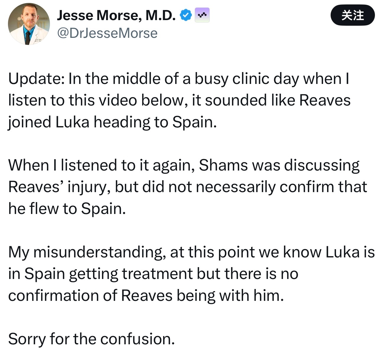 被虚晃一枪医学专家Jesse Morse发推:“据报道,东契奇将和里夫斯一同前往