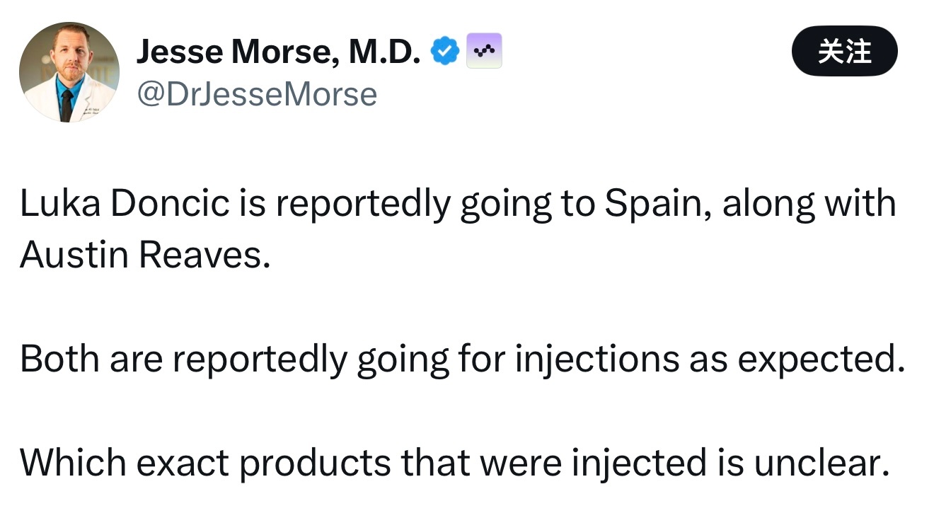 医学专家Jesse Morse发推:“据报道,东契奇将和里夫斯一同前往西班牙。两人均按计划接受注射治疗,具体注射了什么药物尚不清楚。”