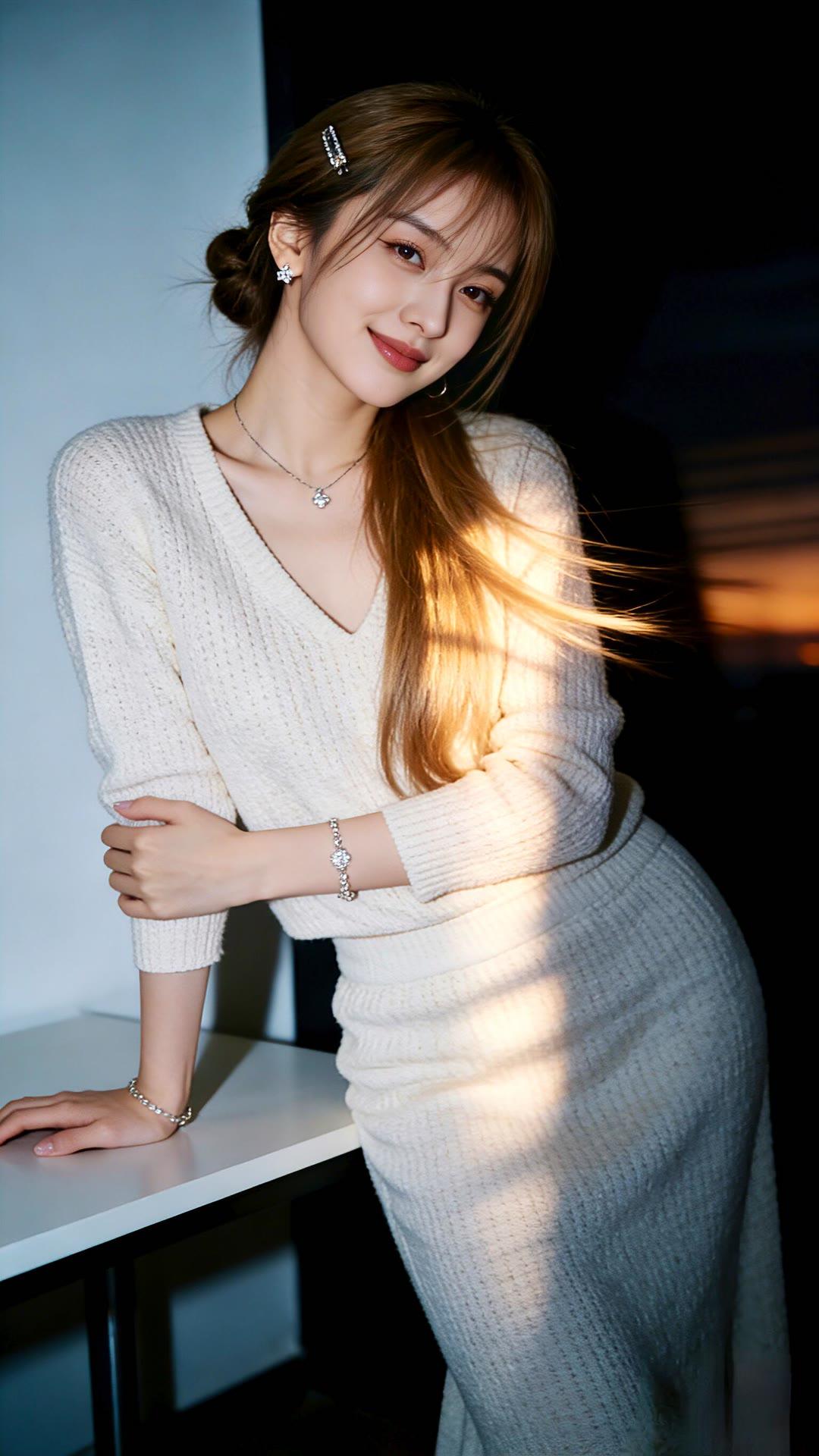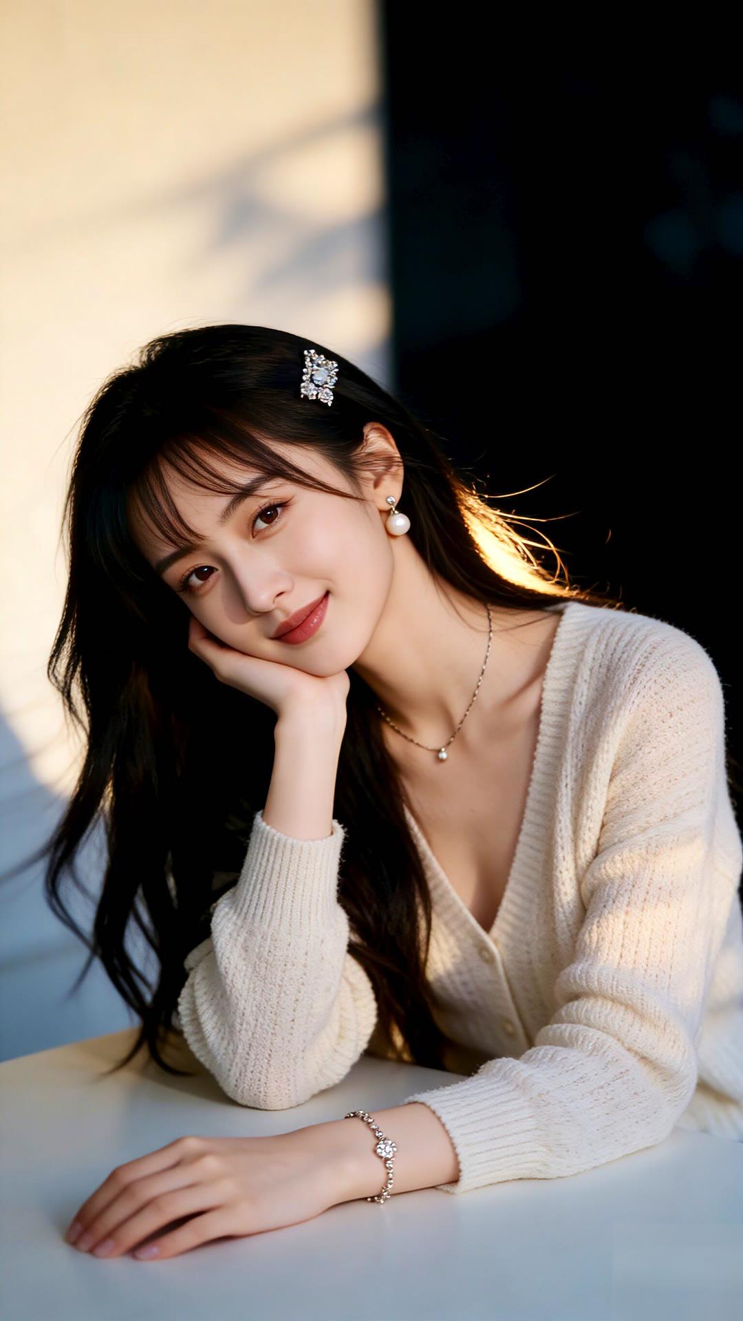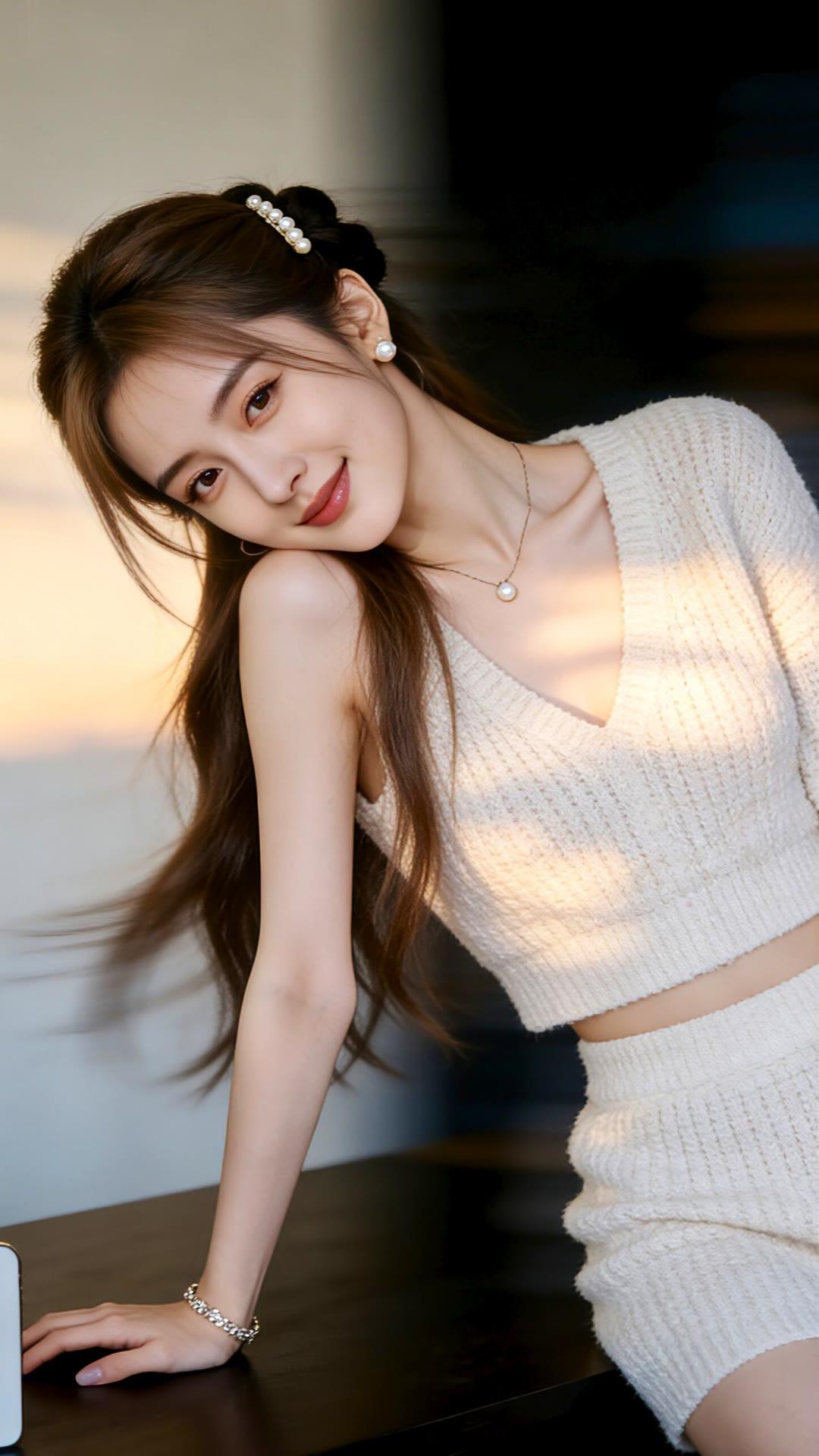 温柔甜美的少女,白色针织裙搭配珍珠项链,散发着优雅的气息。💖✨