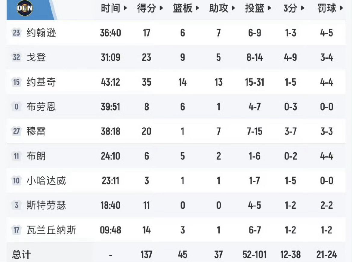 • 尼古拉·约基奇:全场出战43分钟,31投15中,三分5中1,罚球4中4,爆砍35分14篮板13助攻5抢断2盖帽的超级三双!正负值+7,末节+加时赛独得19分,攻防两端完全统治比赛,成为NBA历史上首位单场拿到35分14篮板13助攻5抢断2盖帽的球员,用一己之力带队完成逆转;