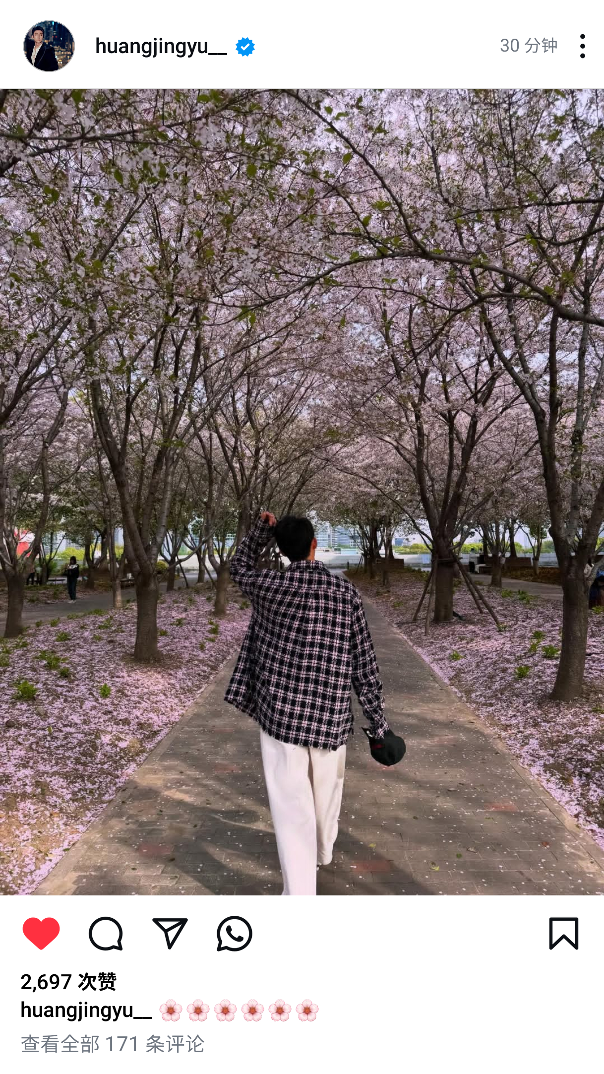 黄景瑜︱ins掉落20260407更新ins赏樱一张我就知道他一定会去赏花的,这是魔都春天最美的一段时光!路盲的我看不出这是哪儿,有人看出来了吗? 补:路人视频无意中拍到地点滨江大道,同行人还是J3,哈哈哈
