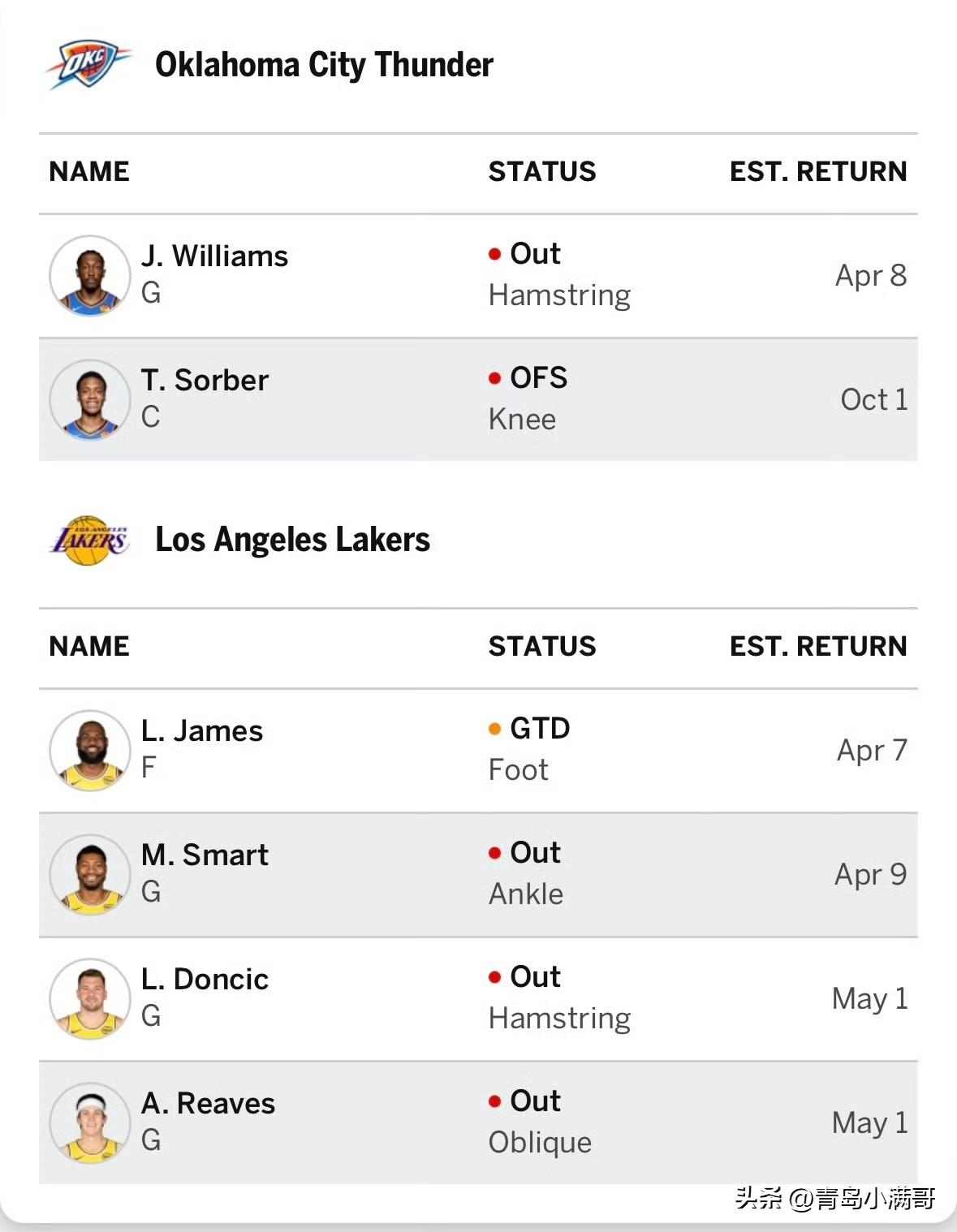 东契奇左腿筋拉伤、里夫斯左腹斜肌拉伤、斯玛特右脚踝挫伤,他们三个确定都将缺席比赛。