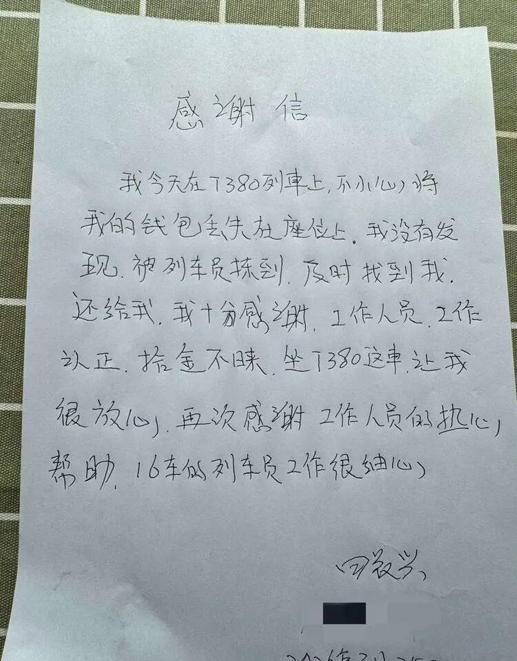 3月31日15时22分,由重庆西开往乌鲁木齐的T379次列车抵达乌鲁木齐站,乘务员在终到巡检时,发现车厢内有一个无人认领的背包。列车长第一时间赶到现场,按规定对背包进行清点核对,包内装有两本护照、户口簿、机动车驾驶证等重要证件,还有现金3730余元。就在此时,铁路12306服务平台接到旅客胡兴华的求助:他下车出站后才发现背包遗落在T379次列车车厢里,十分焦急。列车工作人员立即与胡兴华取得联系,通知其返回站台认领失物。经过现场身份核验与物品逐一核对,背包及所有证件、现金完璧归赵。胡兴华对列车工作人员认真负责、高效暖心的服务表示衷心感谢。