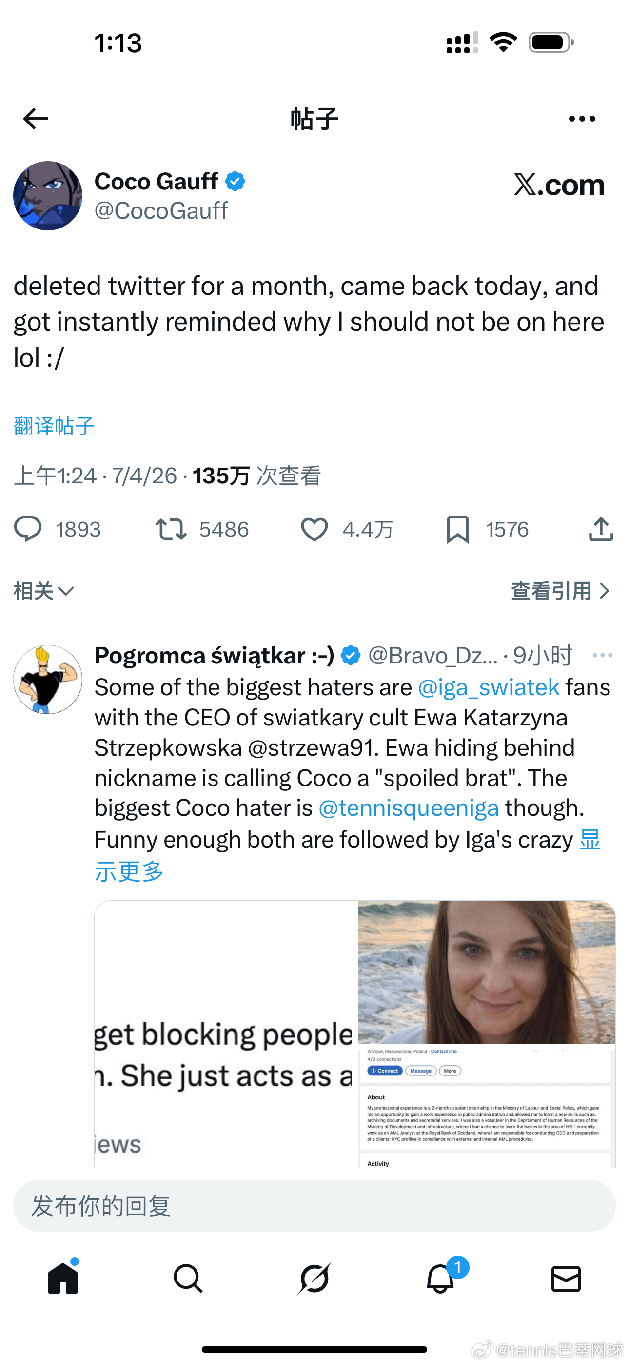 高芙闪现推特并发推:“删掉推特一个月,今天刚回来,立刻就想起来我当初为啥不该玩这玩意儿了,哈哈:/”