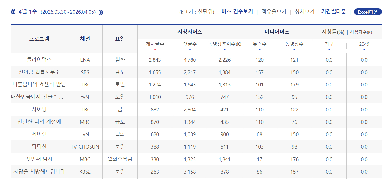 电视剧话题性热度排名:1.《权欲之巅》2.《神与律师事务所》3.《未婚男女的效率恋爱》4.《在大韩民国成为屋主的方法》5.《依然闪亮》6.《在你灿烂的季节》7.《魔女之吻》8.《申医生》9.《第一个男人》10.《爱情处方签》