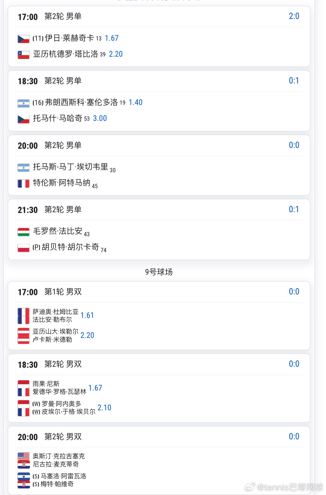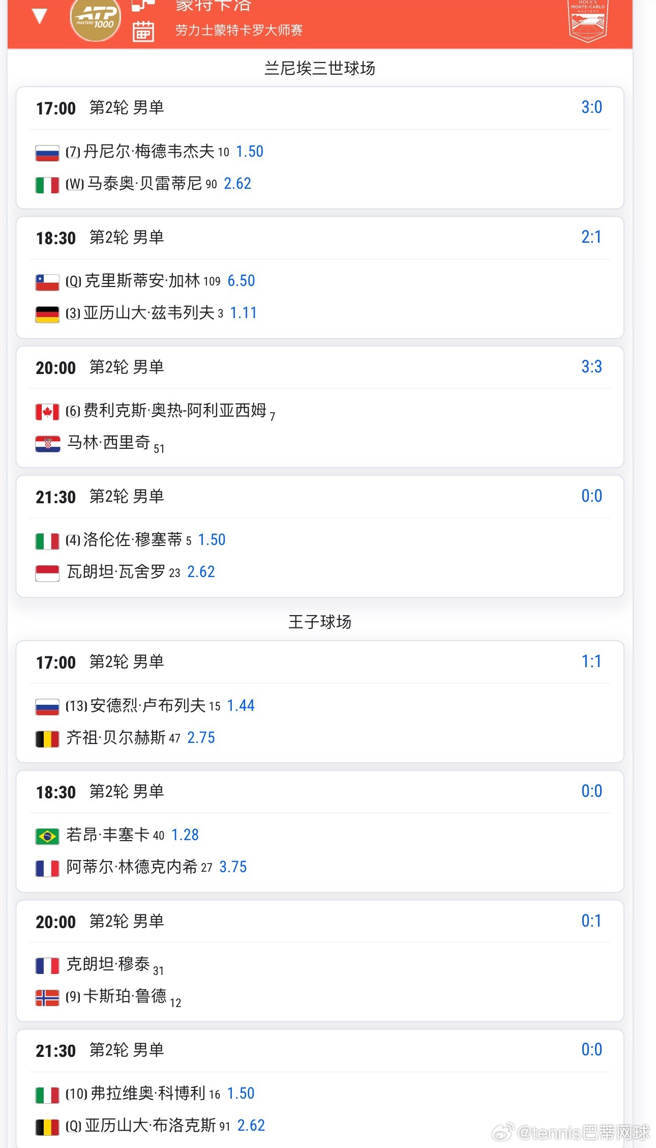 蒙特卡洛中心场17点梅总🇷🇺vs贝雷蒂尼🇮🇹随后加林🇨🇱vs兹维列夫🇩🇪