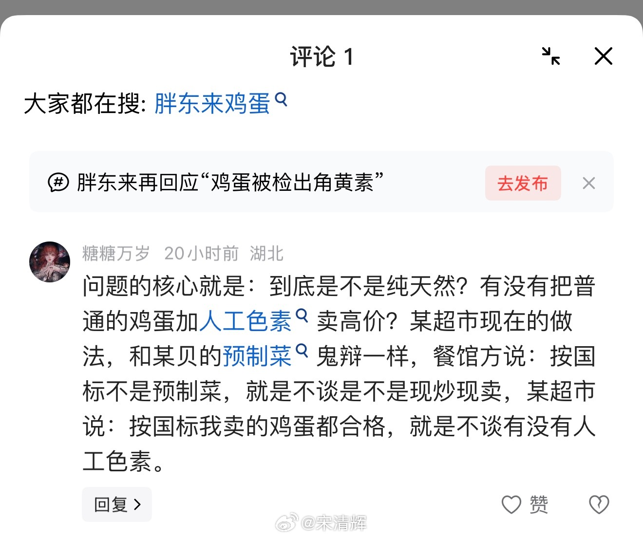 湖北网友留言 “餐馆方说:按国标不是预制菜,就是不谈是不是现炒现卖,某超市说:按国标我卖的鸡蛋都合格,就是不谈有没有人工色素。”于东来打压言论已无底线
