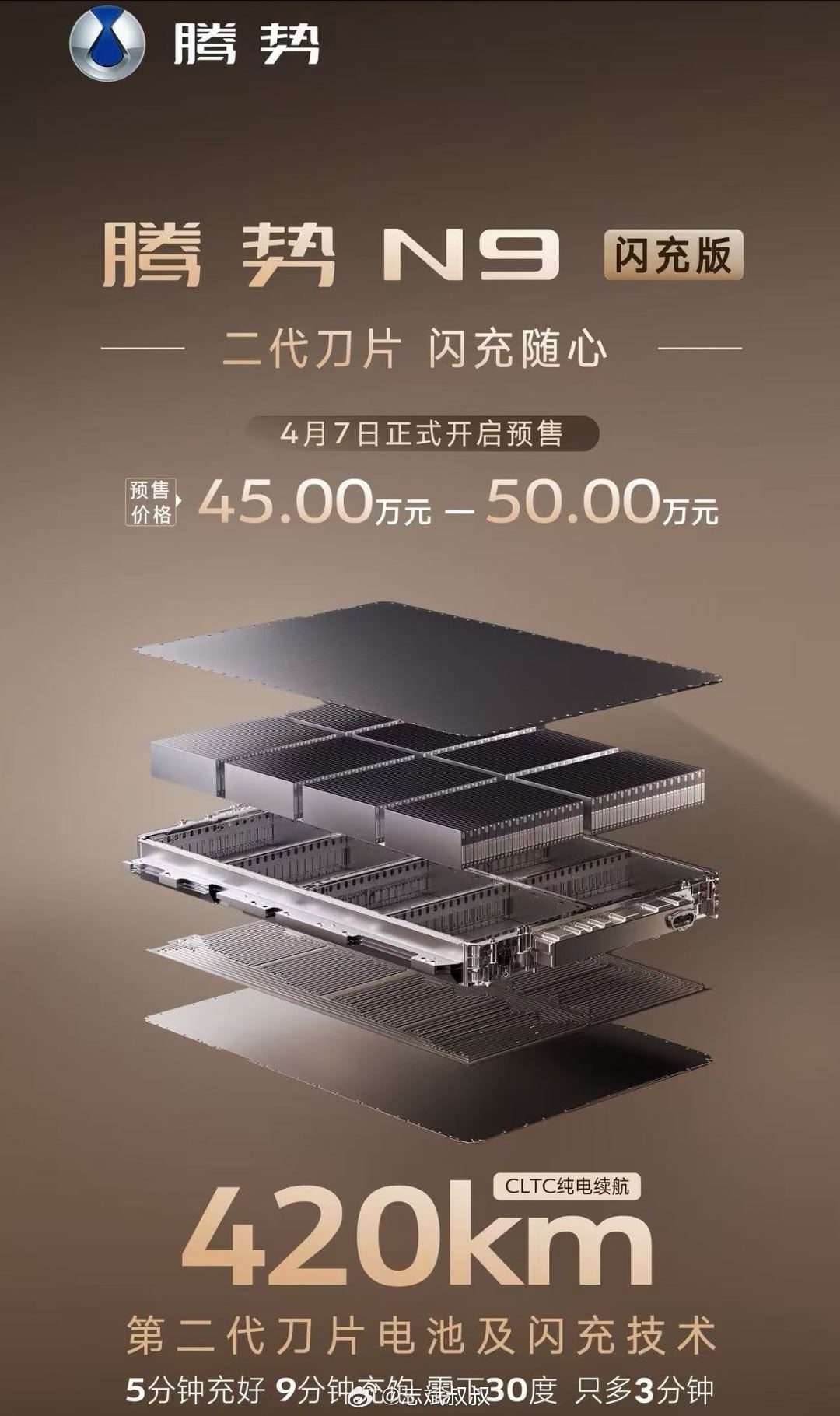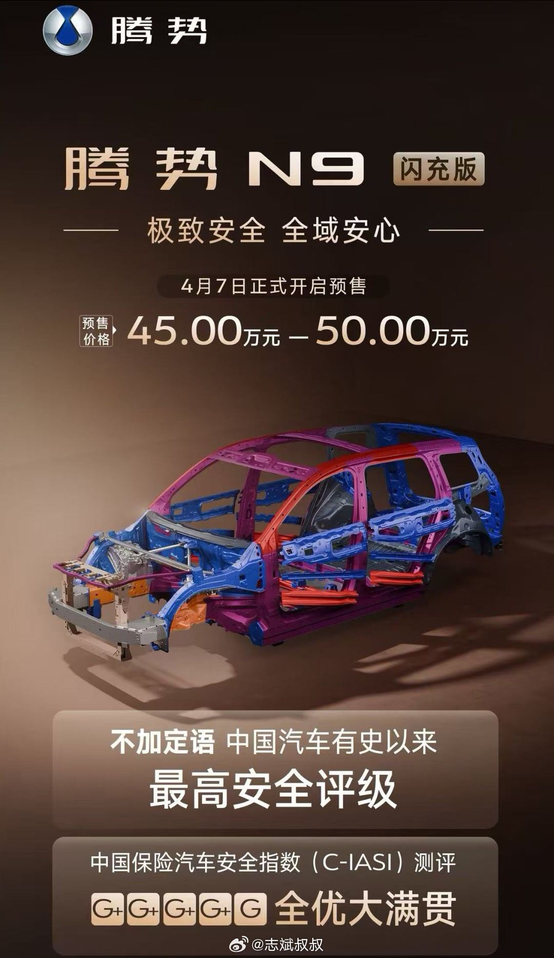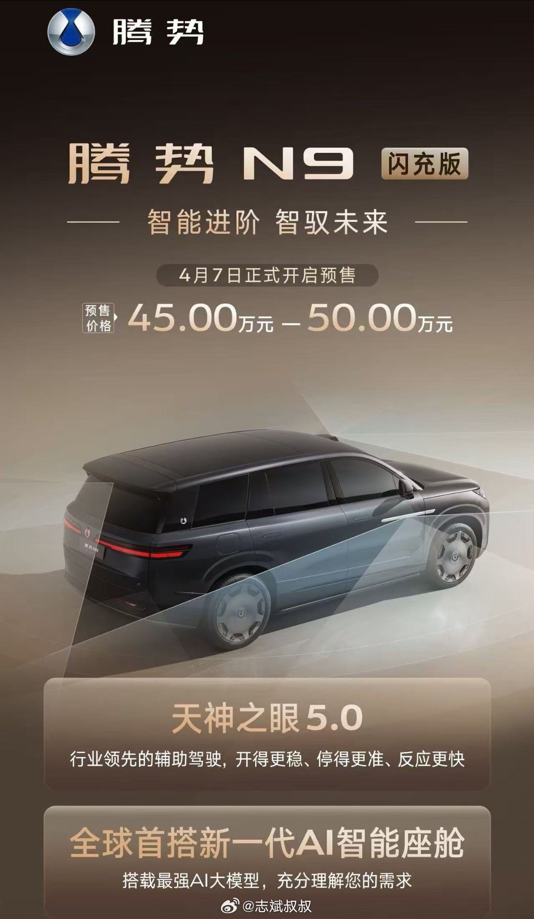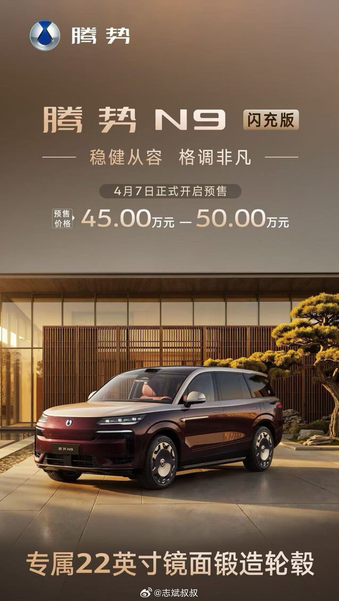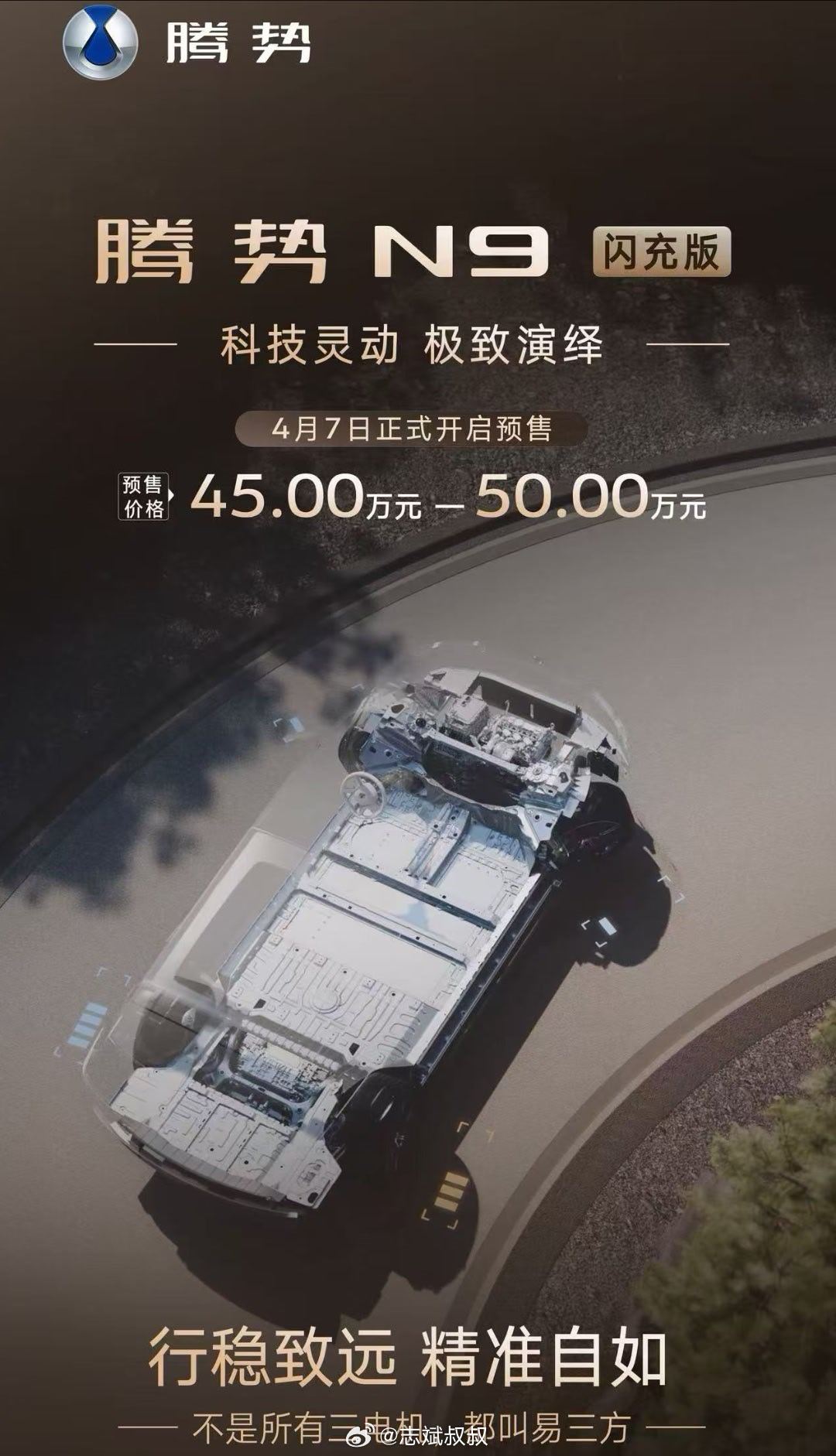 腾势N9闪充版正式开启预售,目前预售价区间是45-50万元。