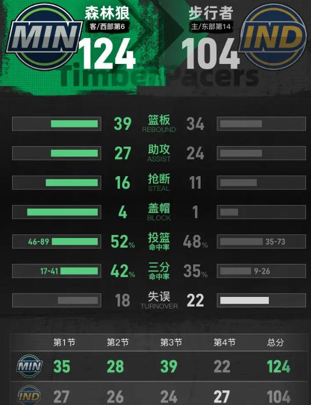 赢了二十分,更衣室却死寂得像输了球。您品,您细品——森林狼这场124-104的"