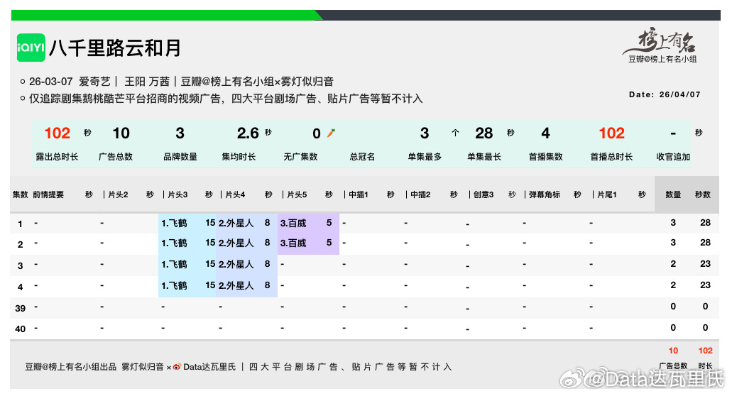 首播4集,招商每集2-3广3品牌总时长102s(仅视频广