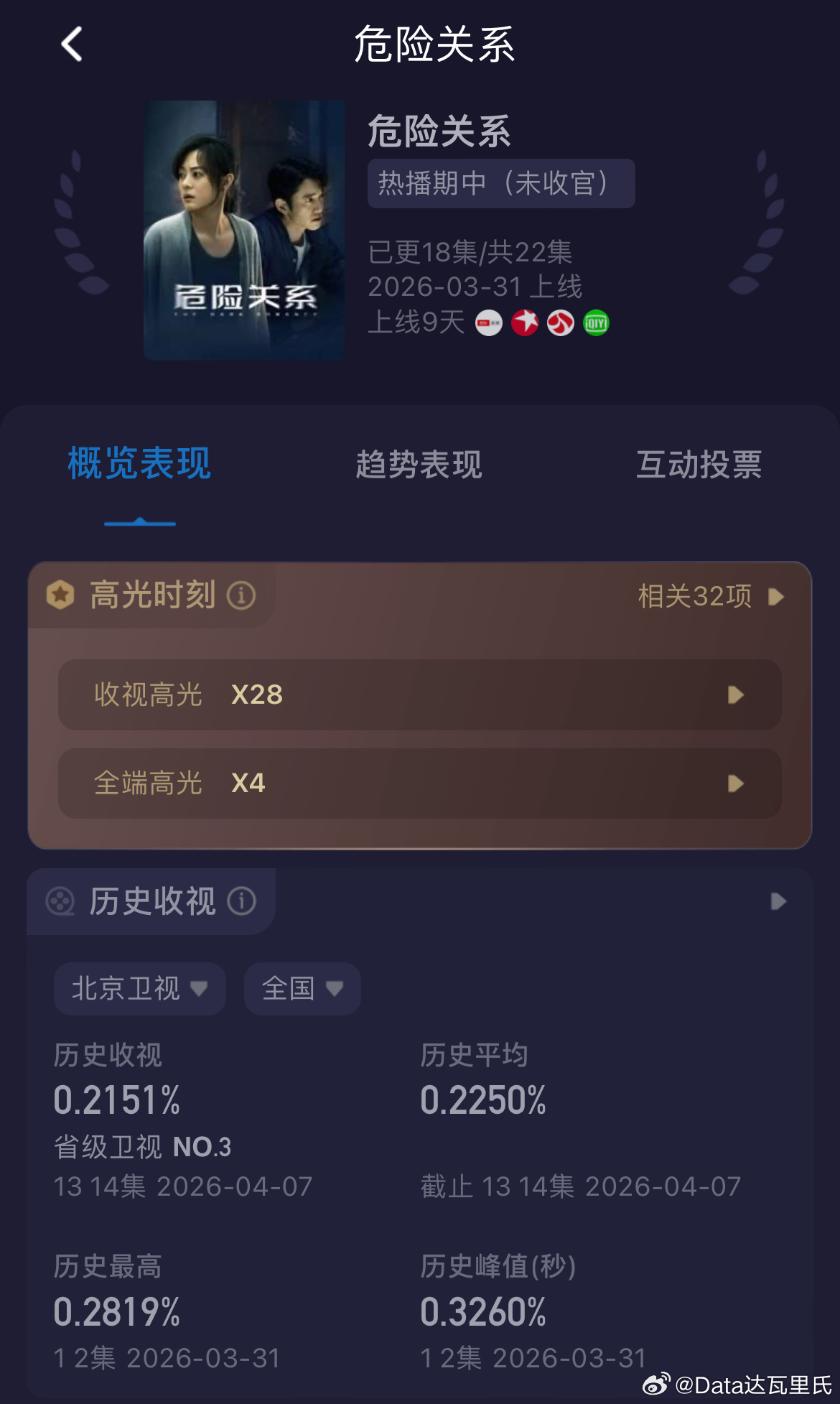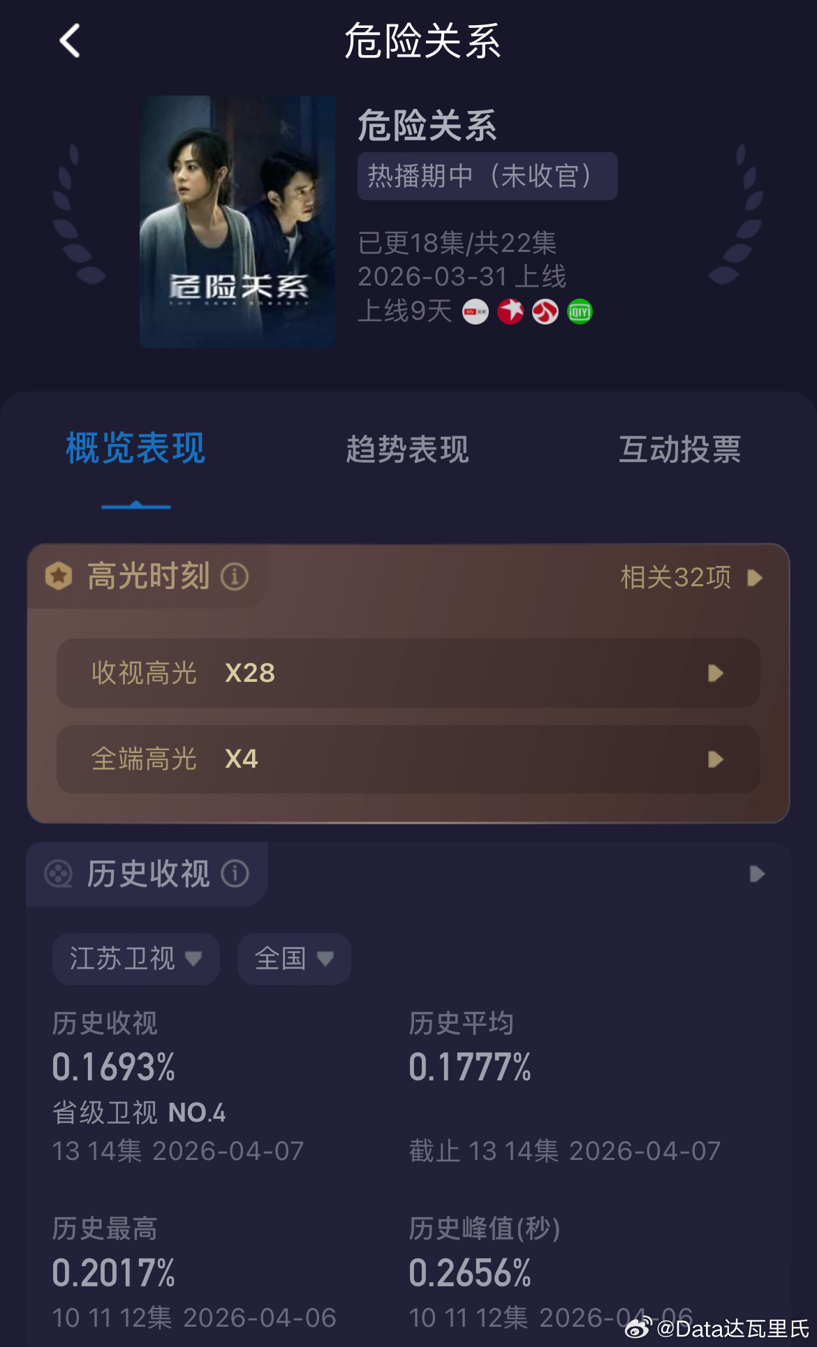 危险关系收视率 当前酷云收视率:东方卫视集均0.3232%北京卫视集均0.225%江苏卫视0.1777%