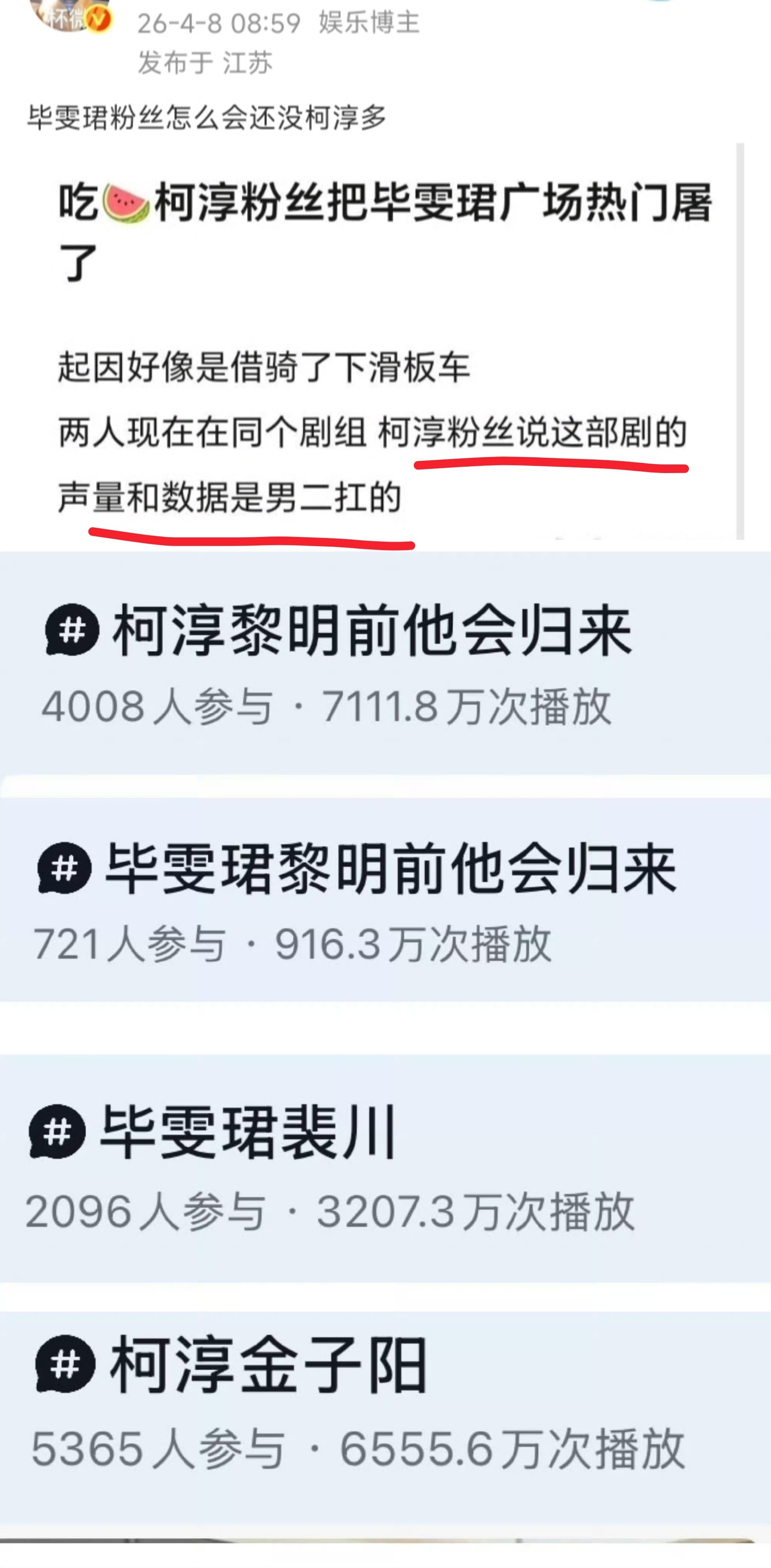 柯淳在剧组借用了男主毕雯珺的滑板车之后,男主粉丝说怕他会传染。。。而柯淳粉丝说整个数据声量都是他家男二在扛。