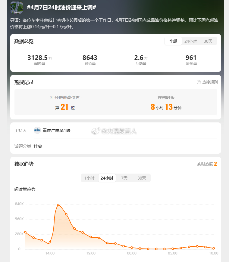 本地附近的一家民营加油站,昨天油价7.68元每升,95与92同价、免费洗车。今天涨了一毛三,每升7.81元我翻了一下以往发言,去年11月左右,油价每升在5.8元左右。4月7日24时油价迎来上调,热点观点 ,国家继续出手调控油价,继续对成品油价格采取调控措施