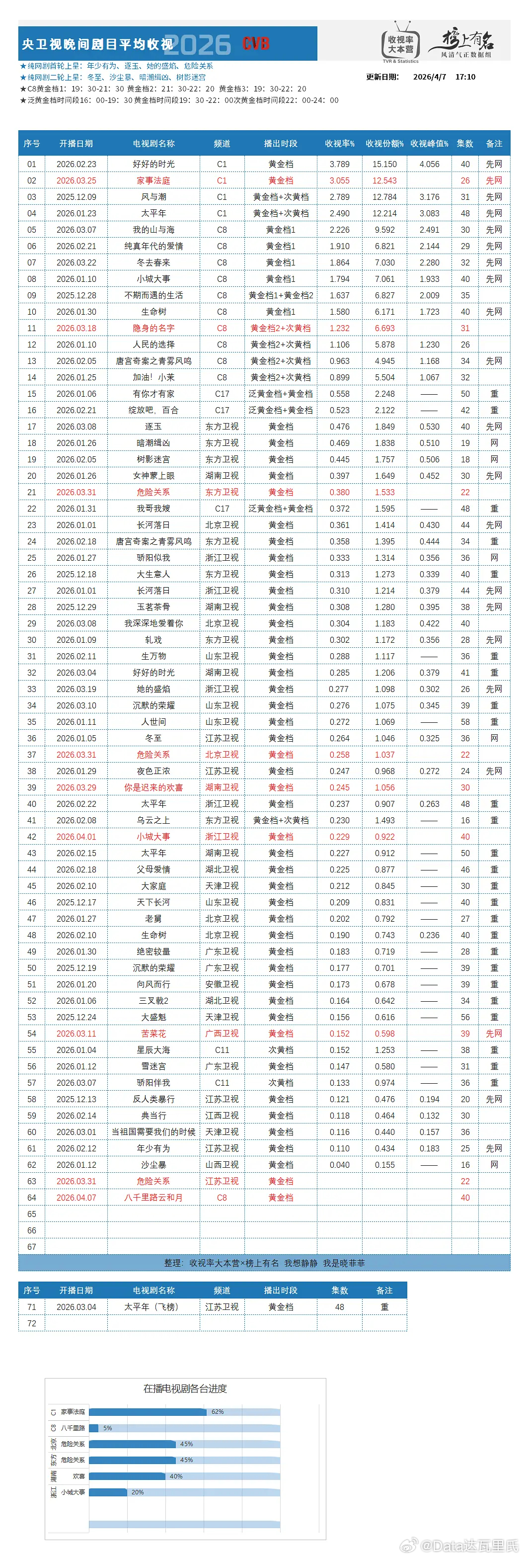 2026CVB收视率总榜&各平台分榜4.7收视率大本营×🌴榜上有名联合发布 观察员:我想静静 ×我是晓菲菲各台年冠👑:(红字为在播剧)央一:好好的时光3.789%26年冠+CVB史亚央八:我的山与海2.226%东方卫视:逐玉0.476%湖南卫视:女神矇上眼0.397%北京卫视:长河落日0.361%浙江卫视:骄阳似我0.333%江苏卫视:冬至 0.264%