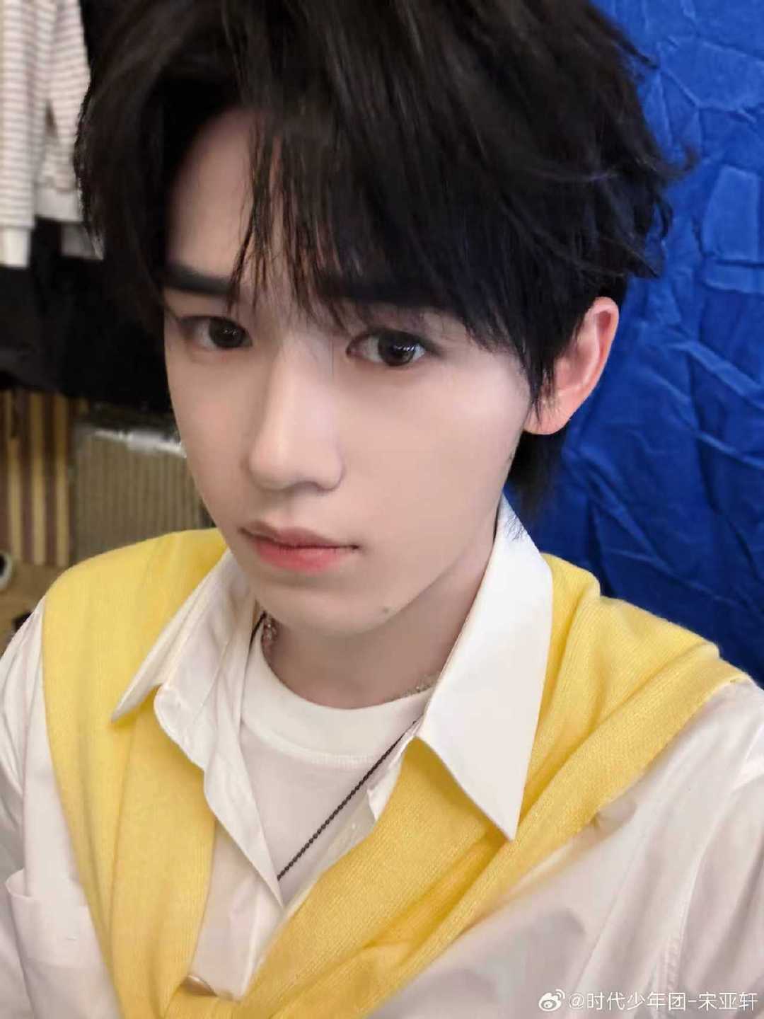 宋亚轩随机掉落两宫格自拍 宋亚轩随机掉落两宫格自拍 白衬衫搭配黄色披肩造型清爽