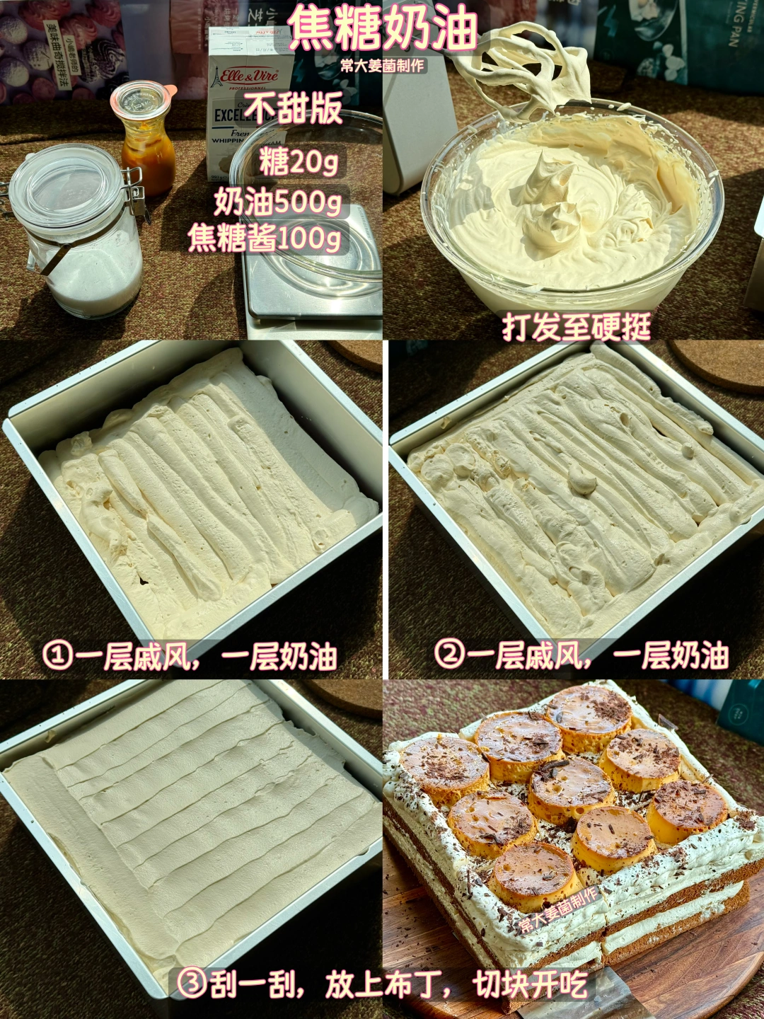 🥛用自己熬的焦糖酱是焦香苦甜的那种味道,打在奶油里别有一番风味,尤其和浓浓的巧克力戚风搭配在一起🍫