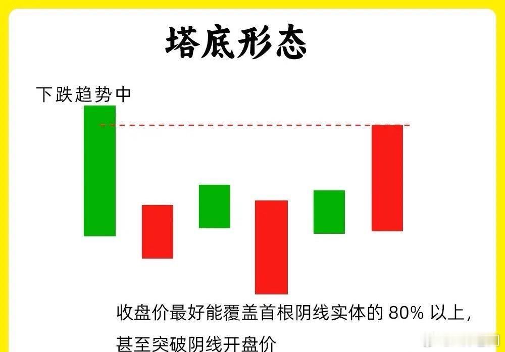 注意了!散户判断真假底部,一直是最为薄弱的一个环节。而我一旦看到这八个形态,我一定要认真的关注起来。这八个形态最为经典,股价盘整阶段往往都会出现。建议认真看完这期内容还是老规矩,点赞收藏或评论六六六支持一下,我每天分享炒股干货,以免以后想温习找不到了1. 低位并排阳股价在下跌趋势的末期,先是一根中大阴线,随后出现连续两根向下跳空缺口,两根阳线的开盘价和收盘价,基本相同,说明此时的市场有分歧,跳空下跌,最后反而收阳。说明抛压变弱,低位承接力量变强。2. 低档五阳线股价长期下跌以后,首先出现一根中大阴线,随后股价没有继续下跌,而是连续出现五天连阳,甚至更多,虽然都是小阳线,说明市场抛压开始变弱,往往是主力开始吸筹。3. 圆底形态股价长期下跌的过程里,股价先是下跌的阴线,随后股价开始低位横盘,振幅比较小,这是一个市场磨底的过程,主力慢慢洗盘,吸筹,随后成交量逐步放大,股价缓慢上涨,就行圆形的底部形态,也是大级别的底部形态4. 塔底形态也是第一个下跌,盘整,反弹向上的一个过程,首先是出现大阴线,随后出现小阴线小阳线,股价开始不继续走出新低,随后再次出现放量阳线。他的走势会比圆底形态更干脆,更稳健一些5. 连续跳空三阴线股价出现连续的跳空低开的三根阴线,市场上有一句俗语,“一鼓作气,再而衰,三而竭”。连续的三天缺口。6. 平底形态股价处于下跌趋势末期,股价下跌过程里,出现两根K线,他们的最低价基本相同,出现一个同个价格附近,说明下方有比较强势支撑力量。如果此时阳线还能出现放量,那就更好7. 红三兵这个形态大家都熟悉,股价出现连续三天阳线,股价在不断抬高,说明买盘力量开始变强。这种形态,影线部分一般都不会很大。8. 冉冉上升形股价在下跌趋势的末期或是底部横盘阶段,出现八根以上的小阳线,其中可能会出现小阴线或是十字星,但是,他们底部重心,在不断的抬高,形成趋势小幅度向上。这一般是主力的吸筹建仓了。一般这种底部形态时间会比较长好了!以上就是底部的八种形态,下方我准备了对应的案例图,建议文章和案例结合起来看。希望对大家有启发,也是最为基础的内容,一定吃透。我们下期内容再见怎样看出一只股票可以建仓了呢炒股,多久看一次为好股票的基本理论在哪里?庄家是如何操盘的各个级别的k线如何运用股市操作经典口诀
