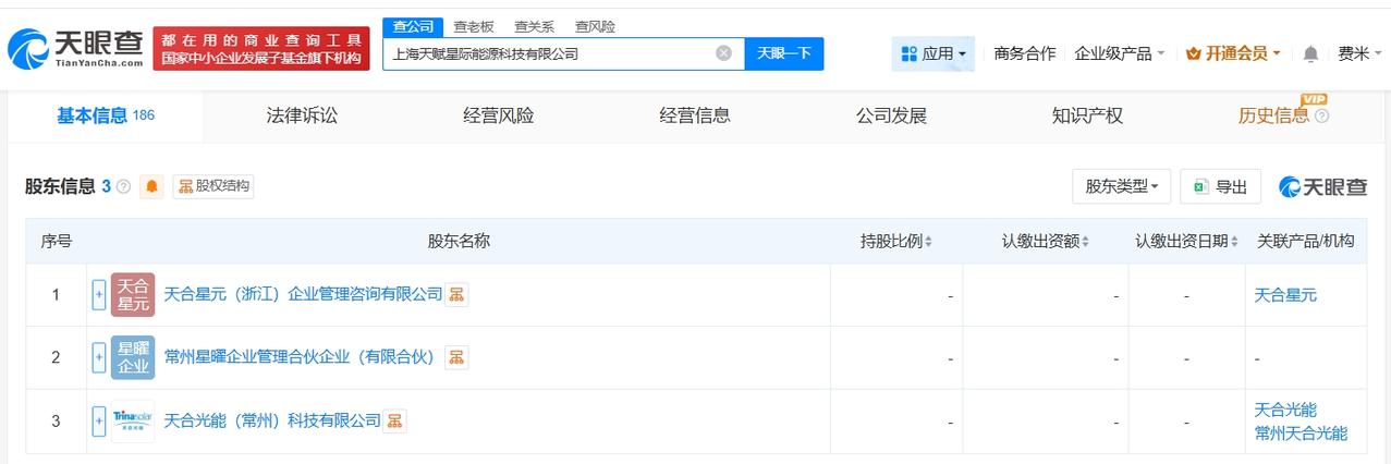 天眼查App显示,4月8日,上海天赋星际能源科技有限公司成立,法定代表人为陈奕峰,注册资本1亿人民币,经营范围包括新兴能源技术研发、太阳能发电技术服务、储能技术服务、光伏设备及元器件制造等,由天合光能(688599)旗下天合光能(常州)科技有限公司、天合星元(浙江)企业管理咨询有限公司、常州星曜企业管理合伙企业(有限合伙)共同持股。