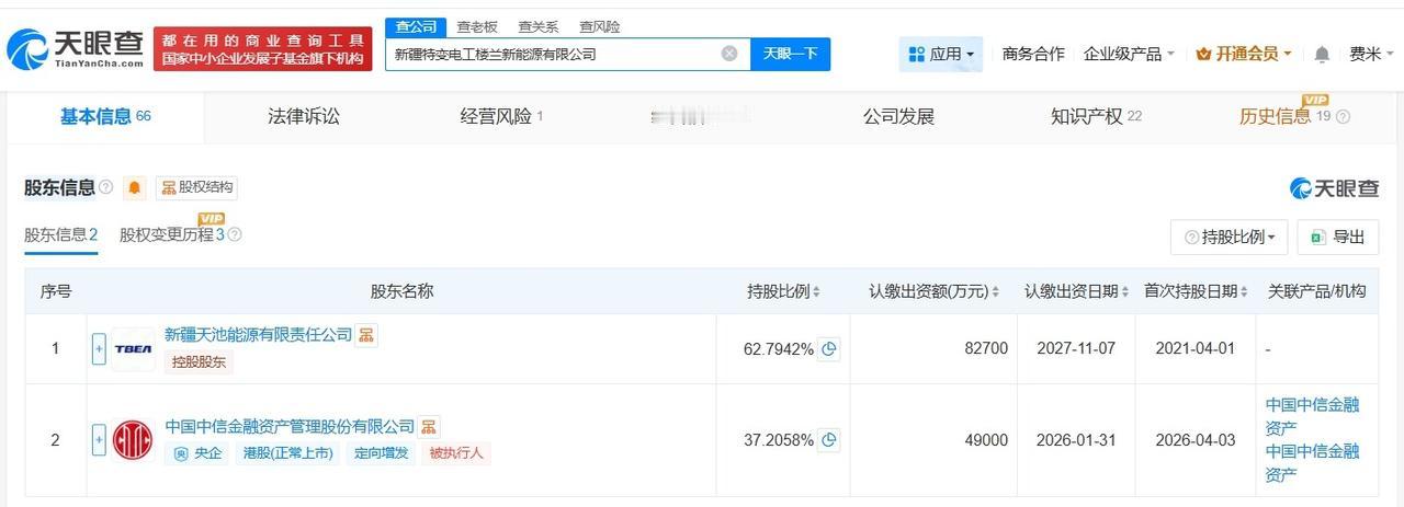 天眼查App显示,近日,新疆特变电工楼兰新能源有限公司发生工商变更,新增中信金融资产(02799.HK)为股东,同时,注册资本由8.27亿人民币增至13.17亿人民币,增幅约59%。