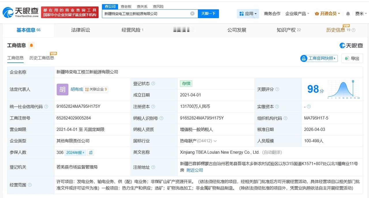 该公司成立于2021年4月,法定代表人为胡有成,经营范围包括发电业务、输电业务、供(配)电业务、热力生产和供应等,现由特变电工旗下新疆天池能源有限责任公司及上述新增股东共同持股。