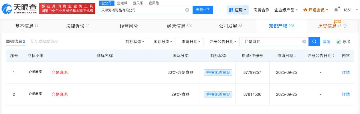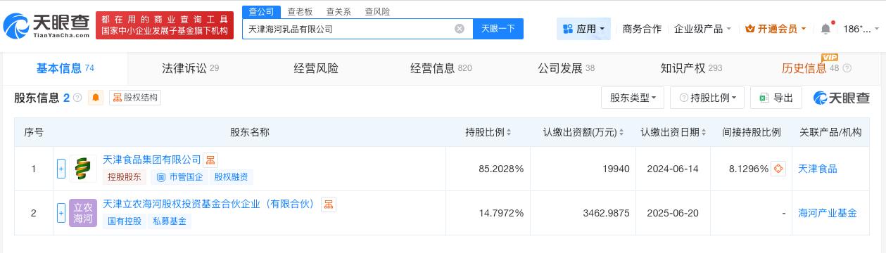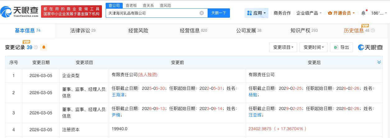 天眼查App显示,天津海河乳品有限公司成立于2019年4月,法定代表人为邹旸,经营范围包括食品生产、饮料生产、婴幼儿配方食品生产等。股东信息显示,该公司由天津食品集团有限公司、天津立农海河股权投资基金合伙企业(有限合伙)共同持股。变更记录显示,2026年3月,该公司注册资本由约2亿人民币增至约2.3亿人民币,增幅约17%。知识产权信息显示,该公司曾申请注册“抖包袱”“介是麻呢”等商标。