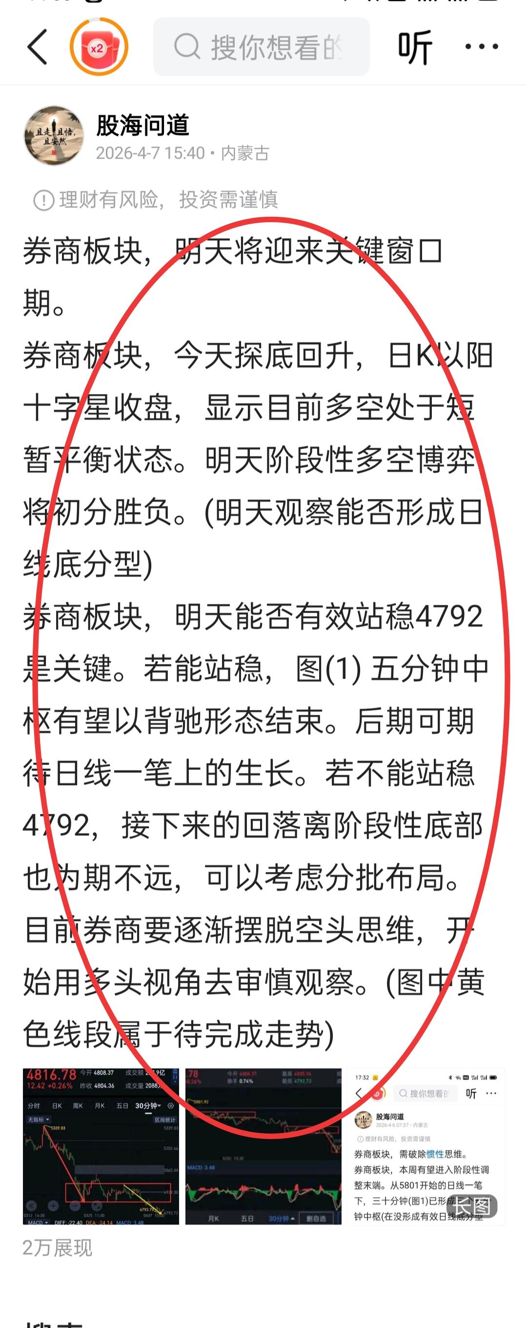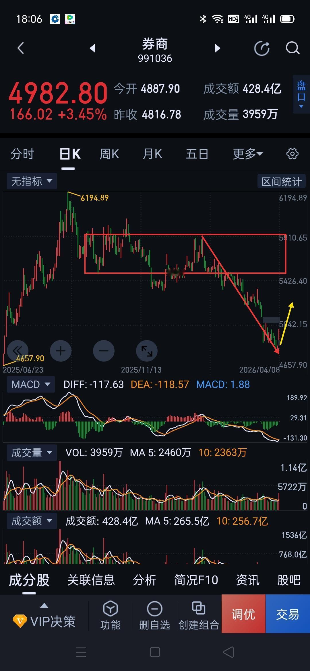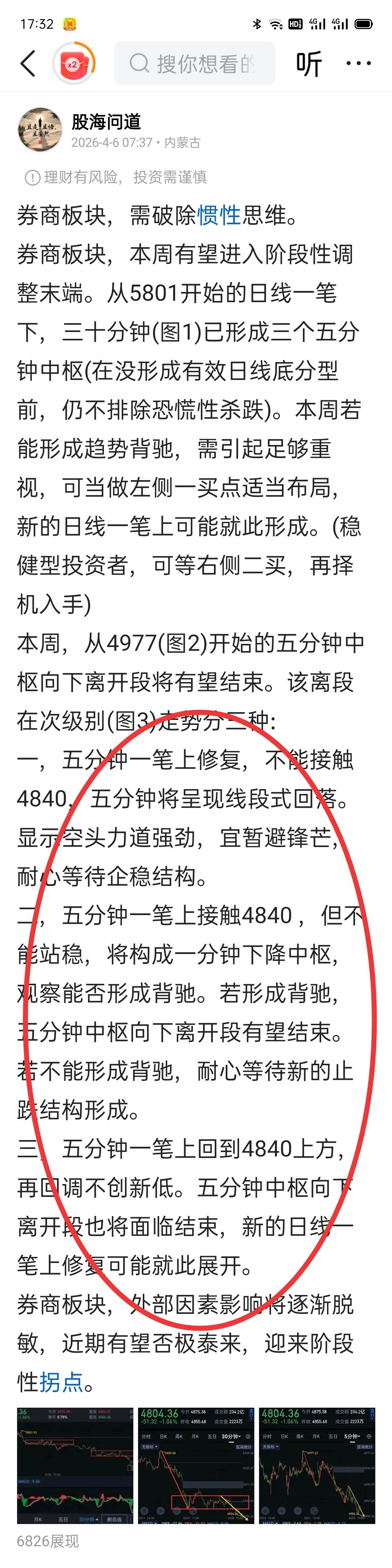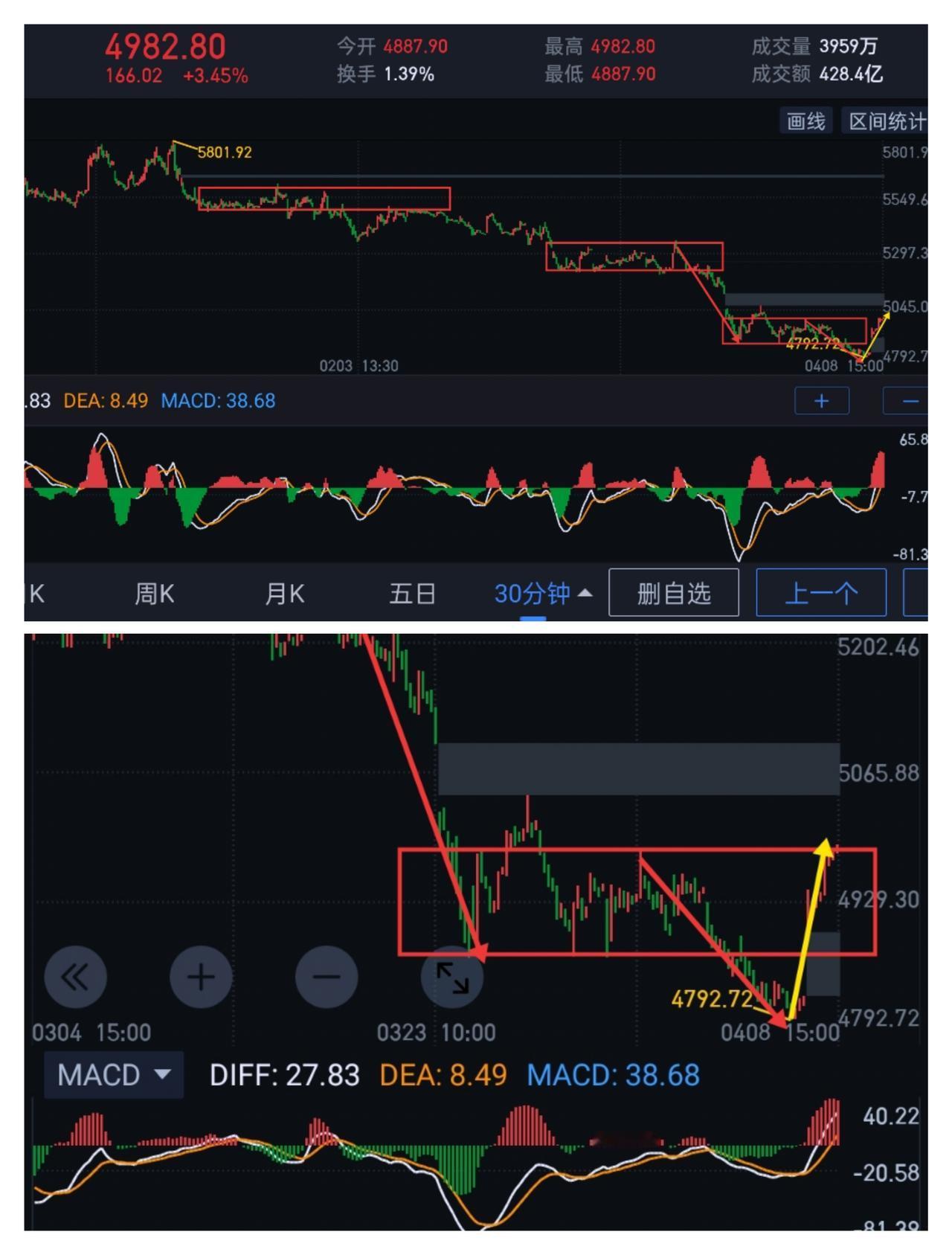 券商板块,浴火重生。 券商熬过了最难捱时段,即将开启新的篇章。 券商,今天量价齐升,日线形成强底分型。五分钟(图1)仍处于五分钟一笔上的延伸中,五分钟一笔上重新站回图(2)五分钟中枢上沿,是一种强势形态的表达。目前走势大概率复刻图(3) 周评阐述的第三种模式。 明天,走势可以归纳为三种: 一,结束当下的五分钟一笔上,随后的五分钟回踩下破4792,继续维持弱势格局(极端情况下会发生)。 二,结束当下的五分钟一笔上,五分钟回踩若不创新低,可视为二次上车机会,从4792开始的三十分钟一笔上将继续向上生长。 三,如果量能持续配合,当下的五分钟一笔上持续向上延伸,短期继续上演逼空行情。如出现此形态,后期回补今天跳空缺口可能性就很小了,五分钟回调可积极参与。 券商近期如能站稳图(2)五分钟中枢,阶段性拐点(图5)有望就此形成。 券商不要停留在以往刻板印象,需要建立多头思维来重新审视。(图中黄色线段属于待完成走势)