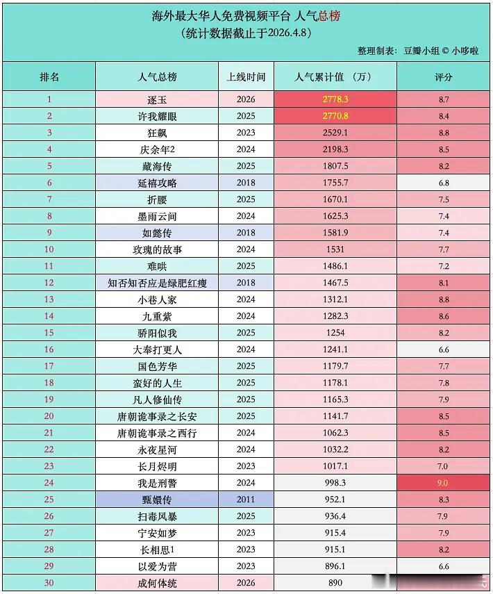 榜组观察|【海外最大华人免费视频平台人气榜2026年度数据追踪】 更4.8总榜前5️⃣:逐玉、许我耀眼、狂飙、庆余年2、藏海转逐玉登顶海外最大华人免费平台人气榜 2025年前5️⃣:许我耀眼、藏海传、折腰、难哄、骄阳似我2026年前5️⃣(暂):逐玉、成何体统、唐宫奇案、轧戏、太平年