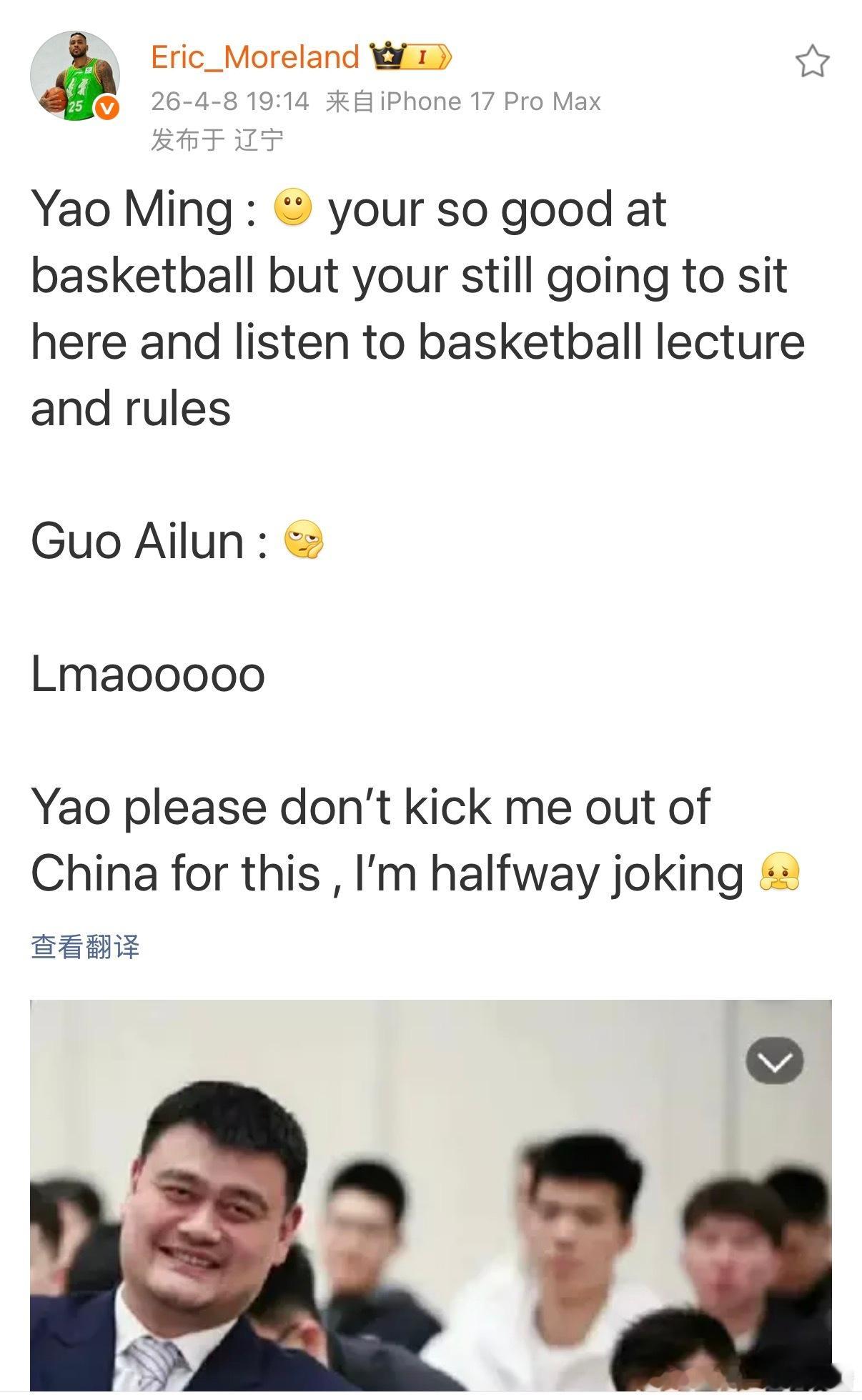 辽宁男篮莫兰德 大莫:强如姚明也得坐着听别人上课,听别人给你讲怎么打篮球以及篮球基本规则哈?