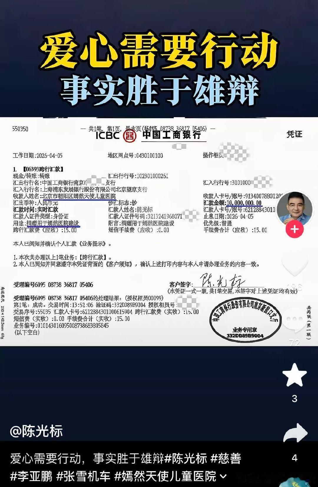【陈光标公开捐赠协议】陈光标公开汇款单 4月8日,陈光标公开向北京嫣然医院捐赠1000万元的协议和汇款单,并配文:“爱心需要行动,事实胜于雄辩。”