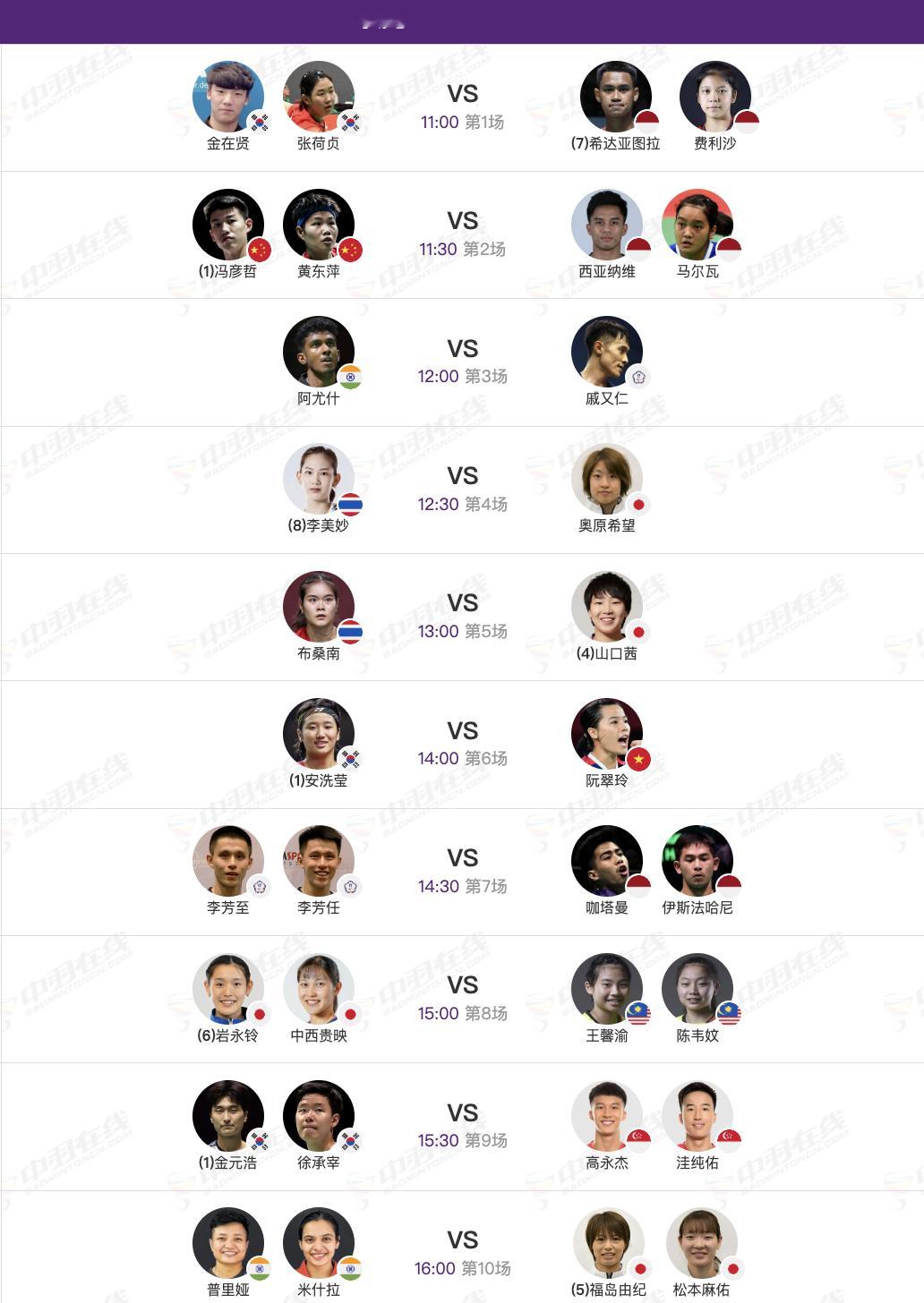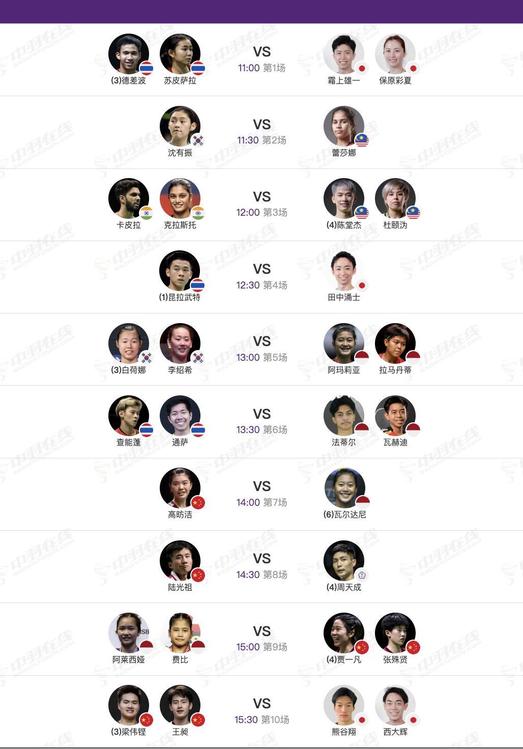 2026年羽毛球亚锦赛 4月9日各单项16进8,早上11点开赛:【1号场地】7、